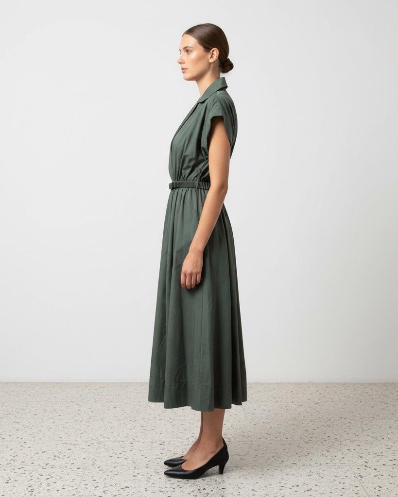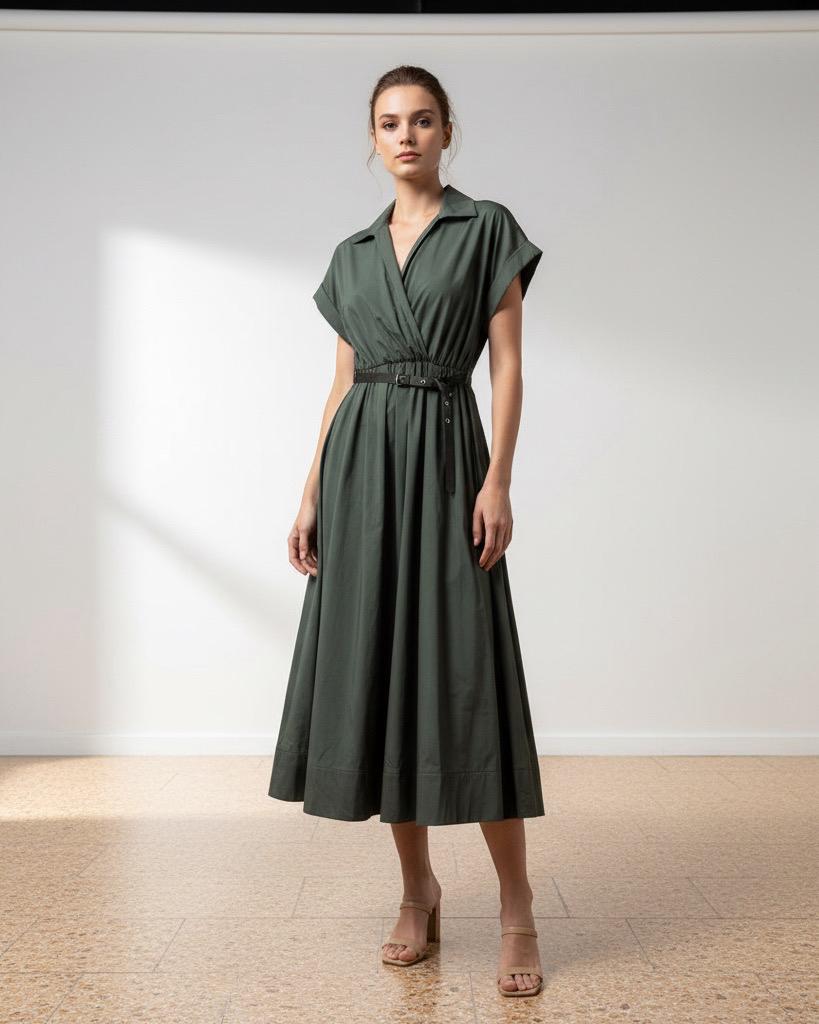 Abito in cotone sostenuto con collo a camicia e profondo scollo leggermente incrociato. Manica ampia, gonna morbida ed elastico cucito sul punto vita. Comode tasche laterali. Cintura in ecopelle