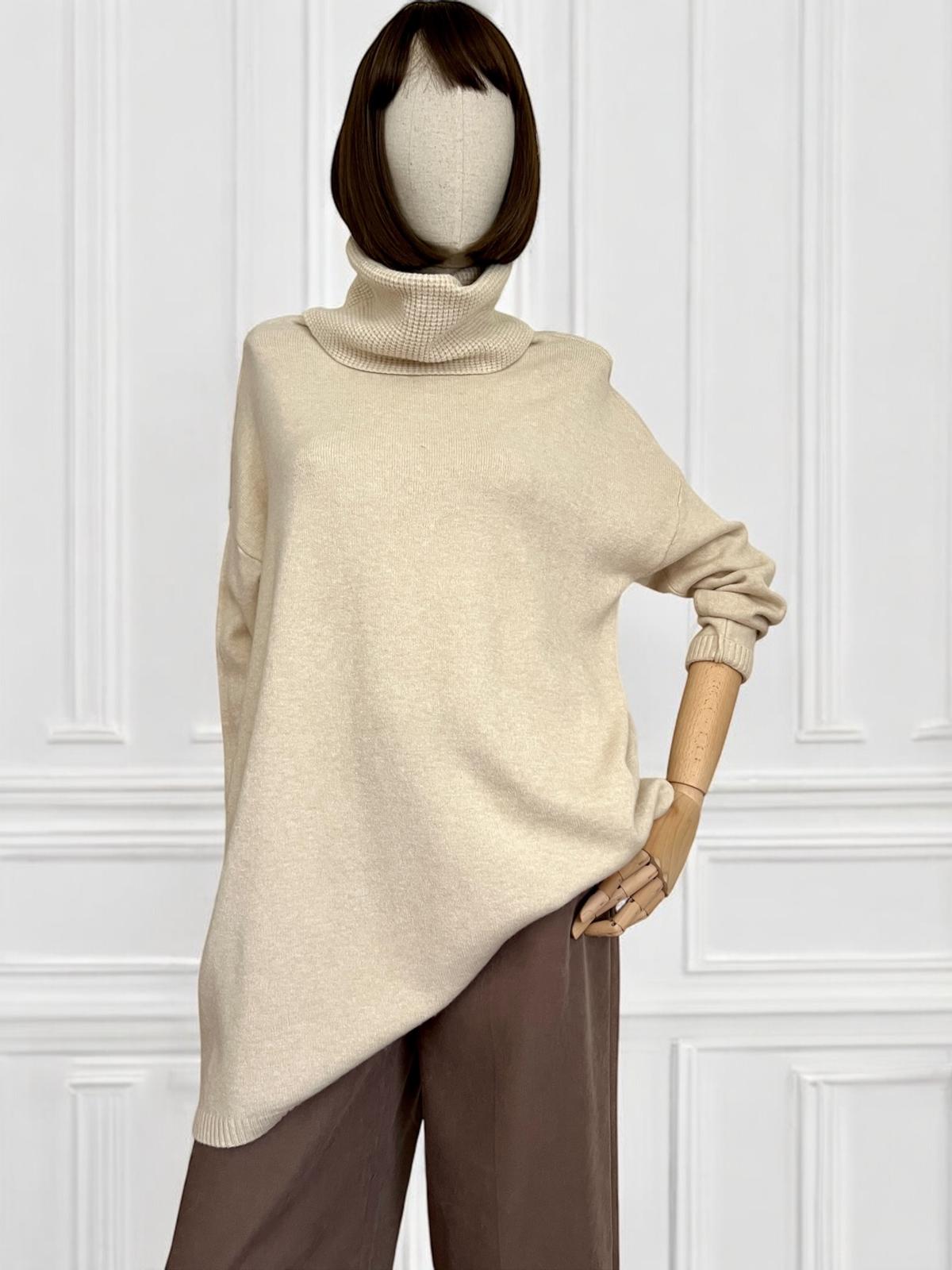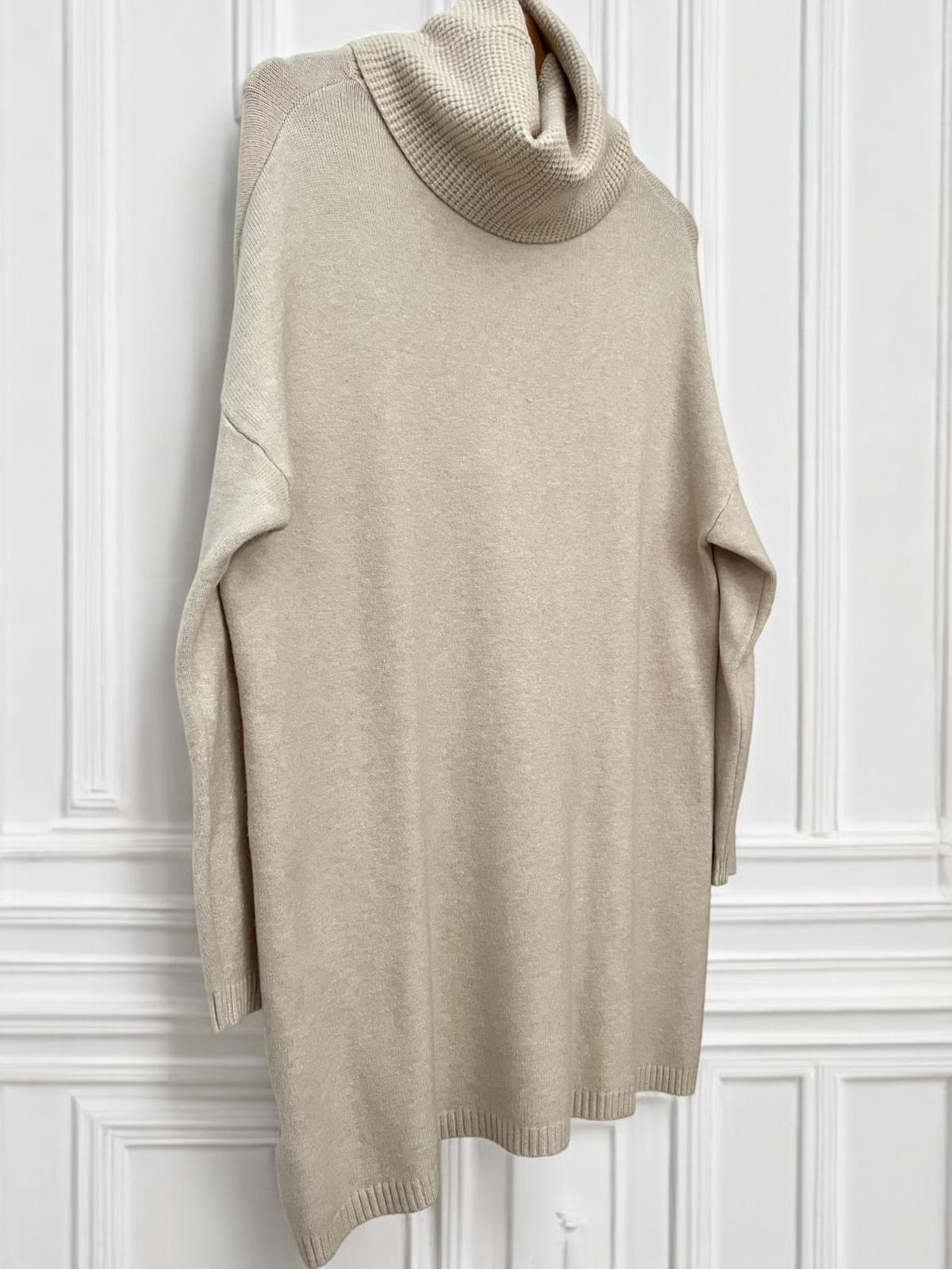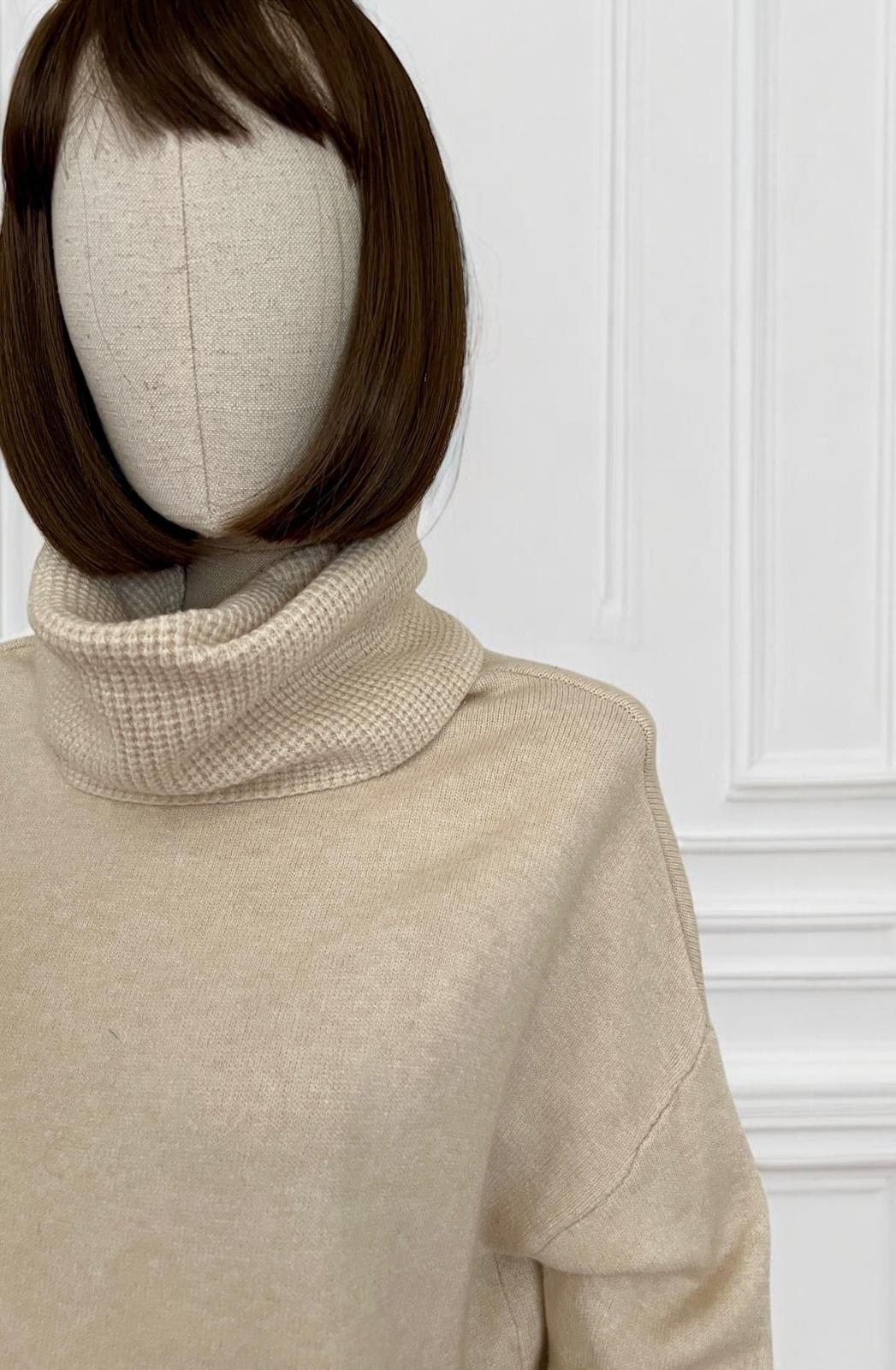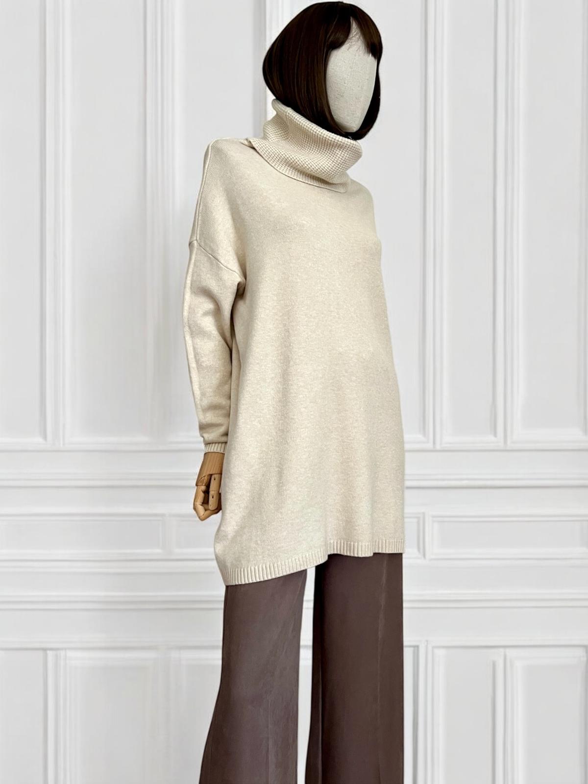 Maxi maglia super soft con collo alto lavorato. Micro coste sul fondo e sui polsini. La linea è diritta e morbida, adatta come abito o come maxi maglia.
