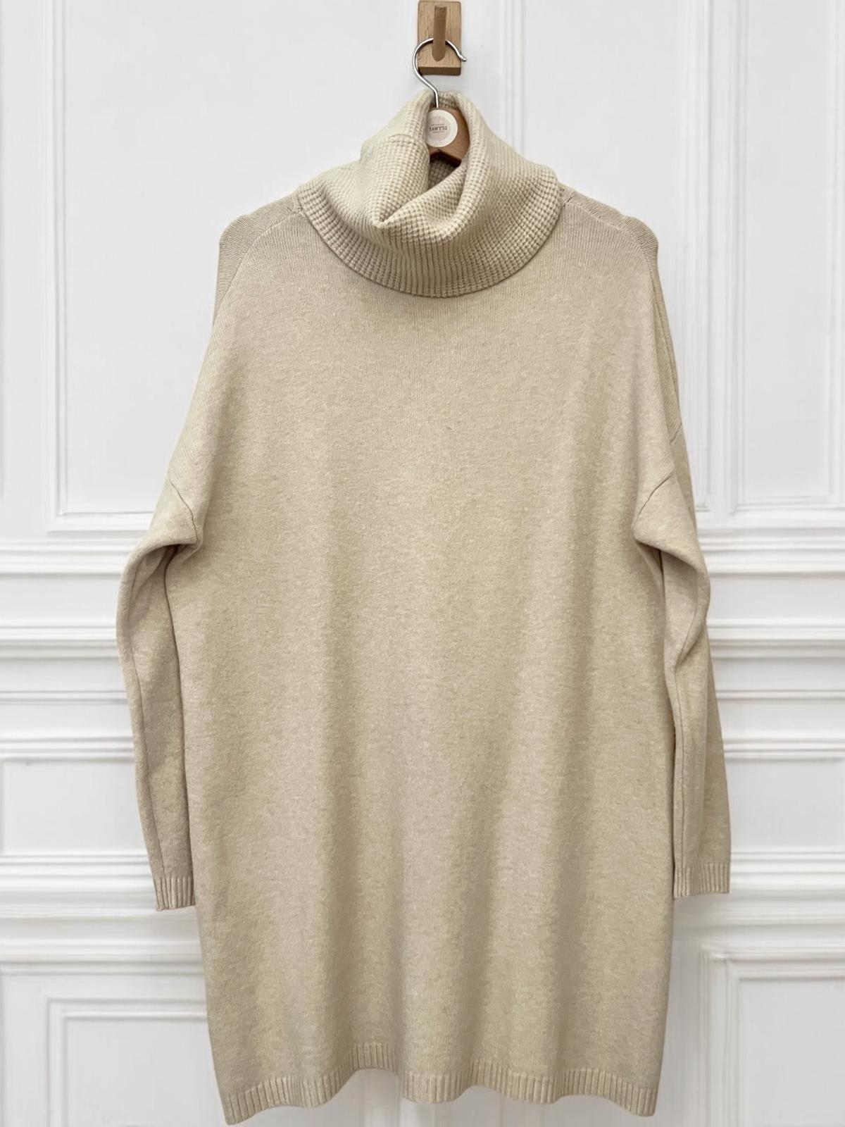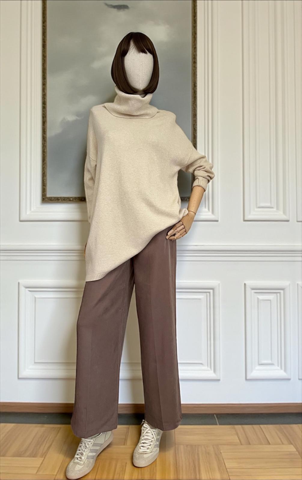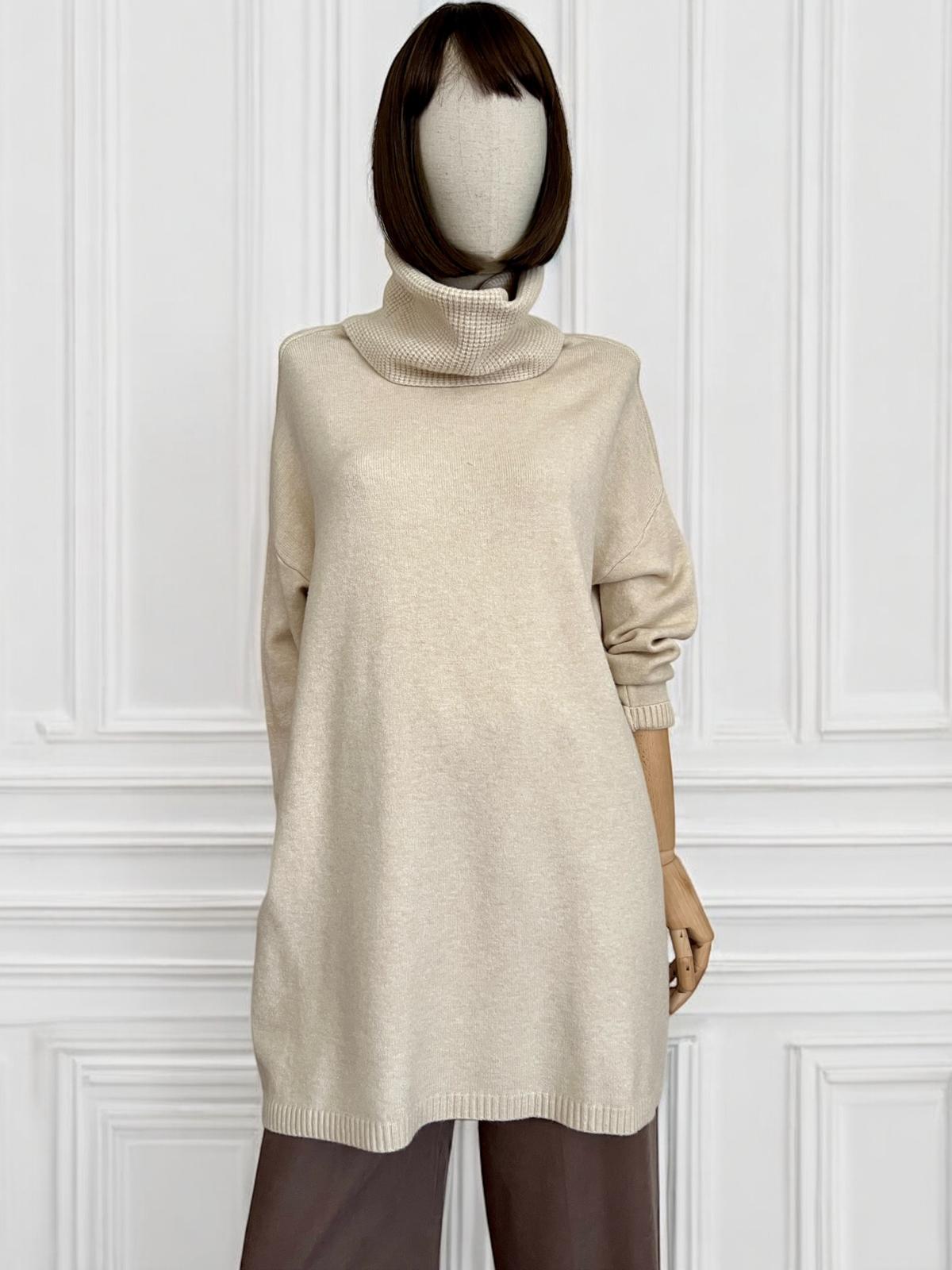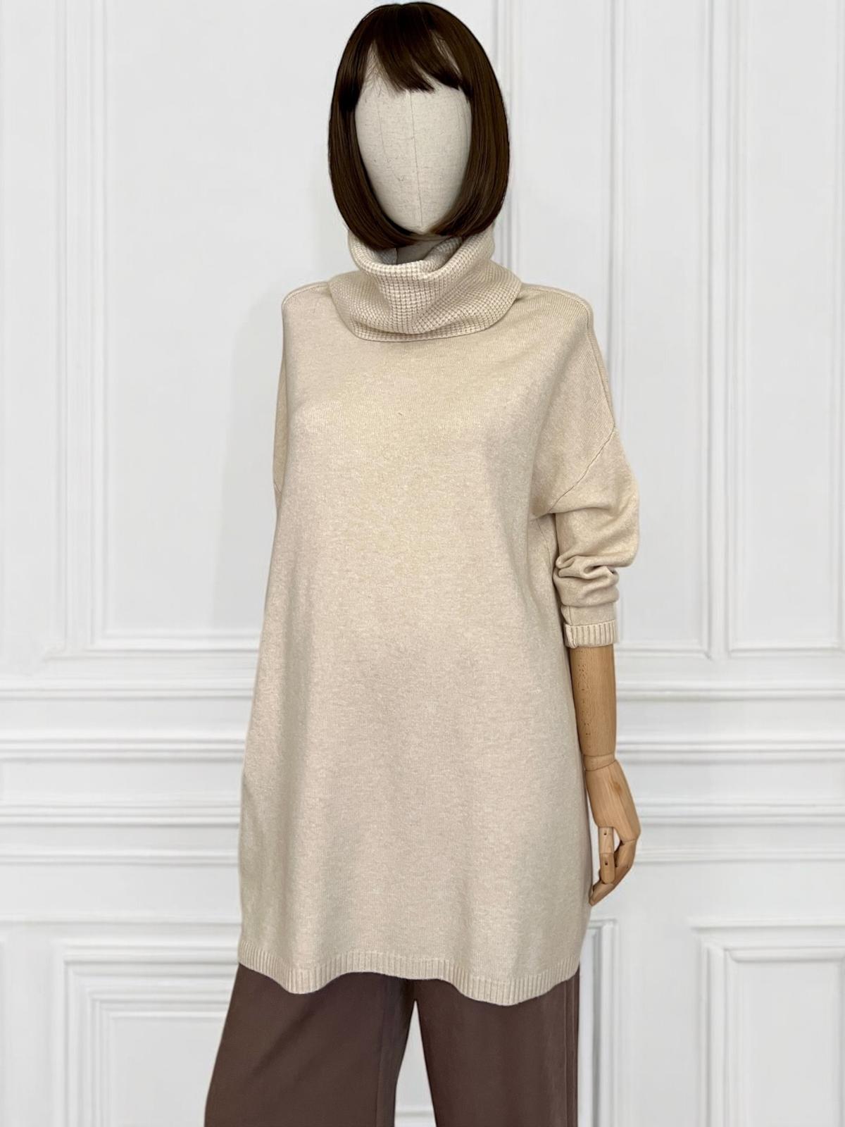 Maxi maglia super soft con collo alto lavorato. Micro coste sul fondo e sui polsini. La linea è diritta e morbida, adatta come abito o come maxi maglia.