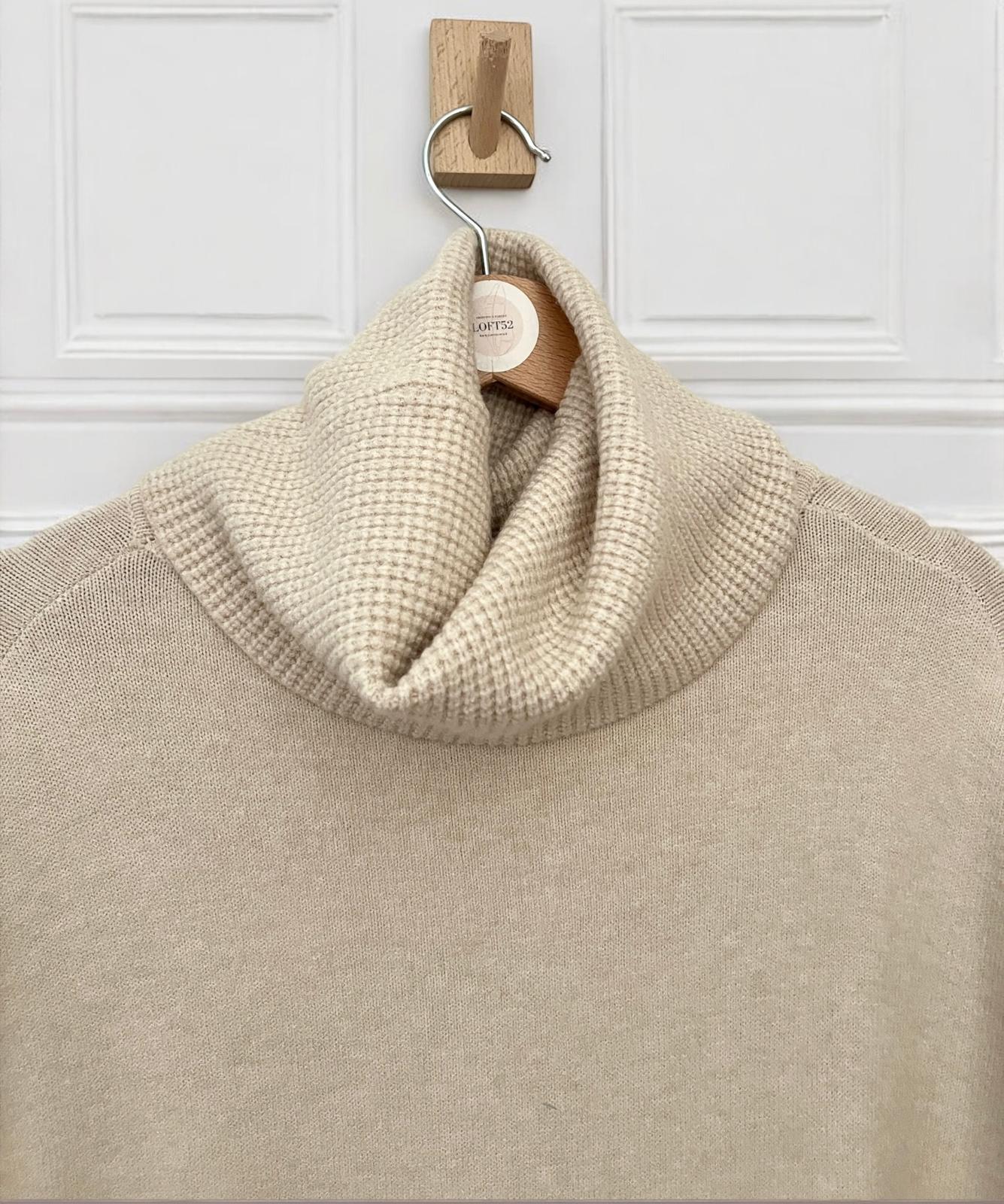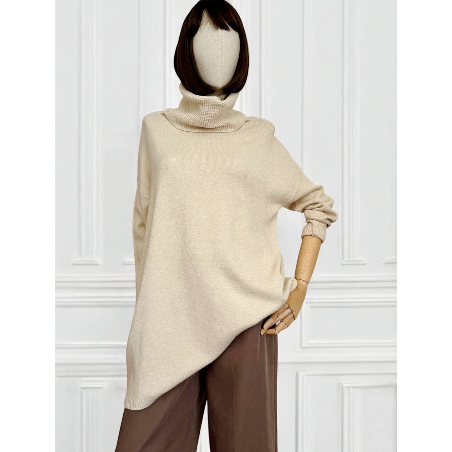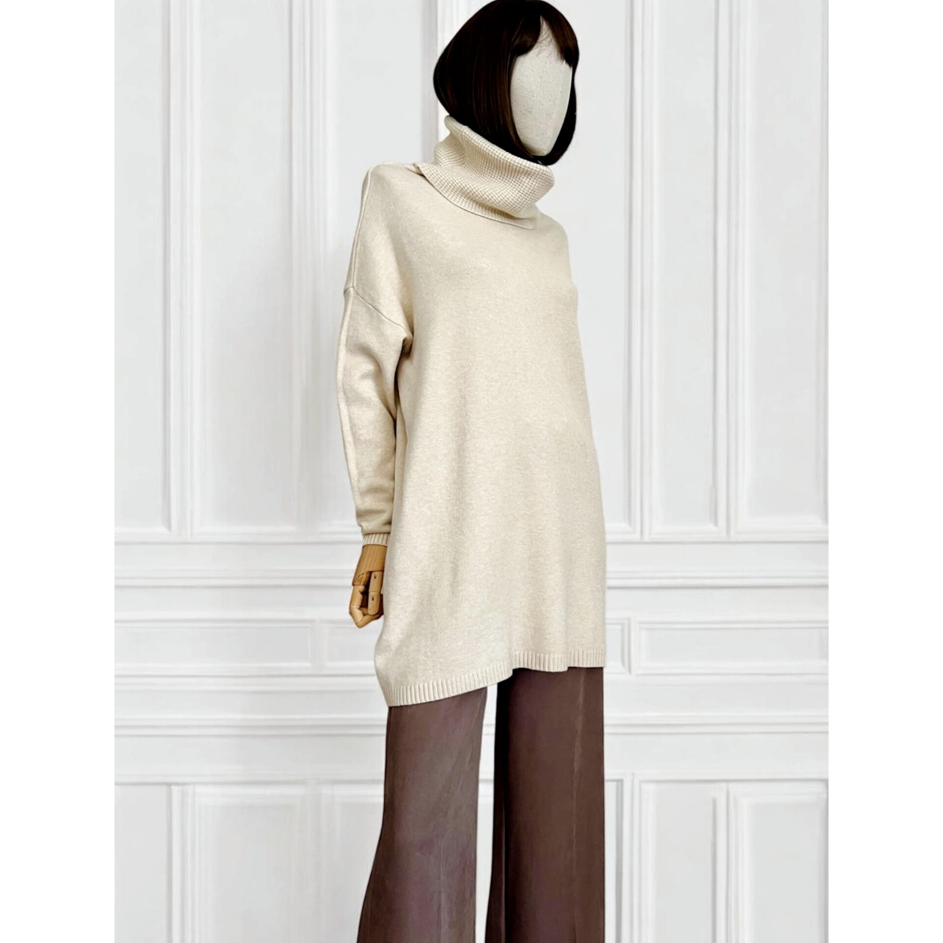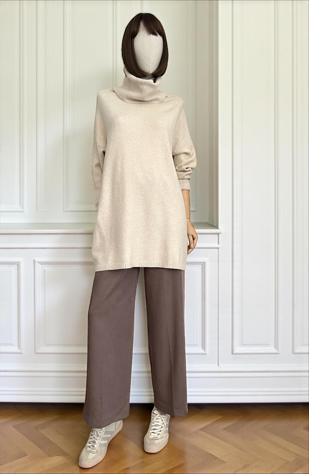 Maxi maglia super soft con collo alto lavorato. Micro coste sul fondo e sui polsini. La linea è diritta e morbida, adatta come abito o come maxi maglia.