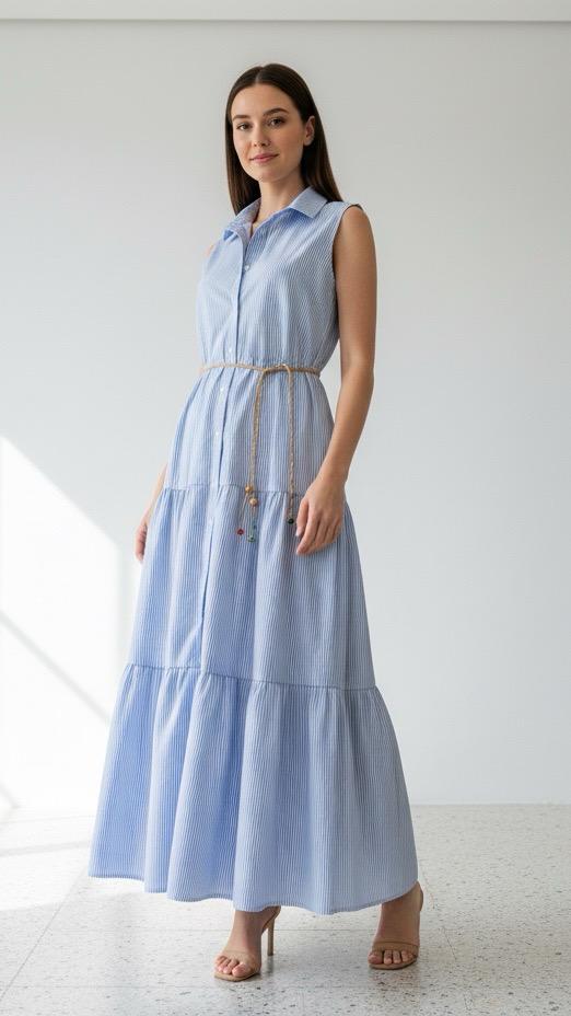 Chemisier in cotone a micro righe verticali. Collo a camicia e balze sulla gonna. Vestibilità dalla S alla L. Cintura con perline inclusa. La modella è alta 176 cm