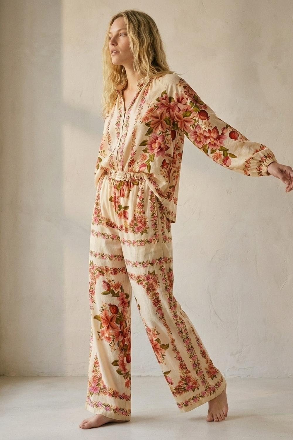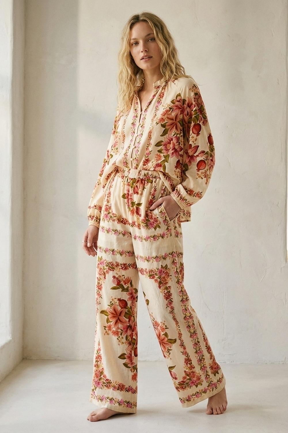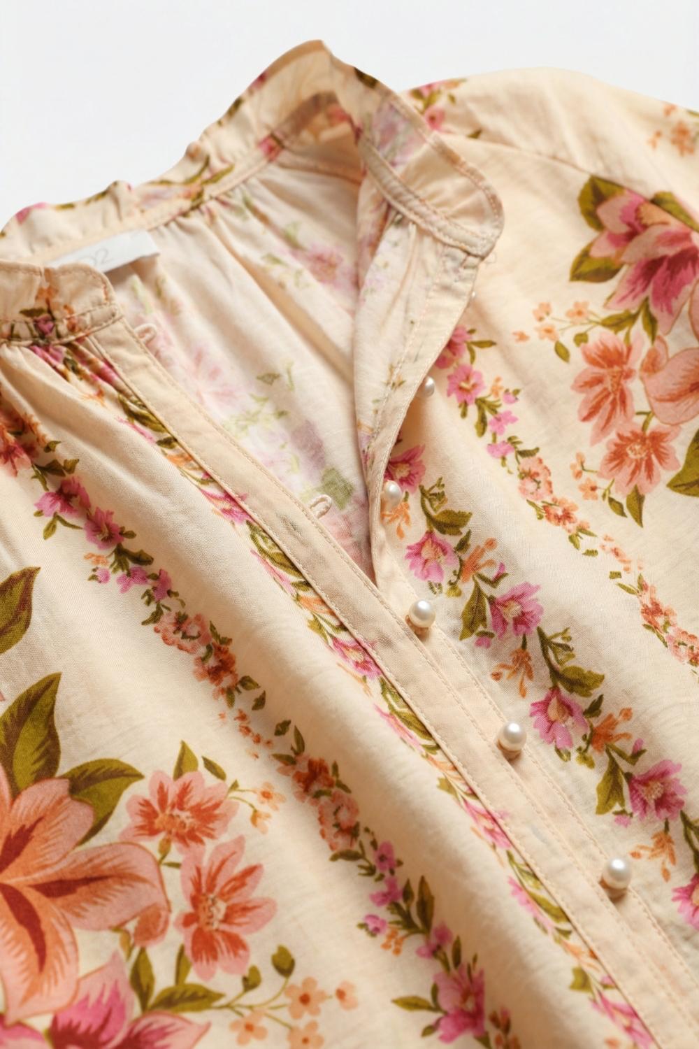 Blusa caratterizzata da un tessuto leggero e traspirante con una delicata stampa floreale dai toni caldi perfetta per un’atmosfera boho-chic. La silhouette rilassata offre una vestibilità comoda impreziosita da maniche lunghe e da una sottile coulisse sulla scollatura per una vestibilità regolabile. Bottoncini frontali per un tocco romantico. Possibilità di abbinarlo al pantalone Flower. La modella indossa taglia S. La modella misura: 86-63-90 Statura: 175cm.