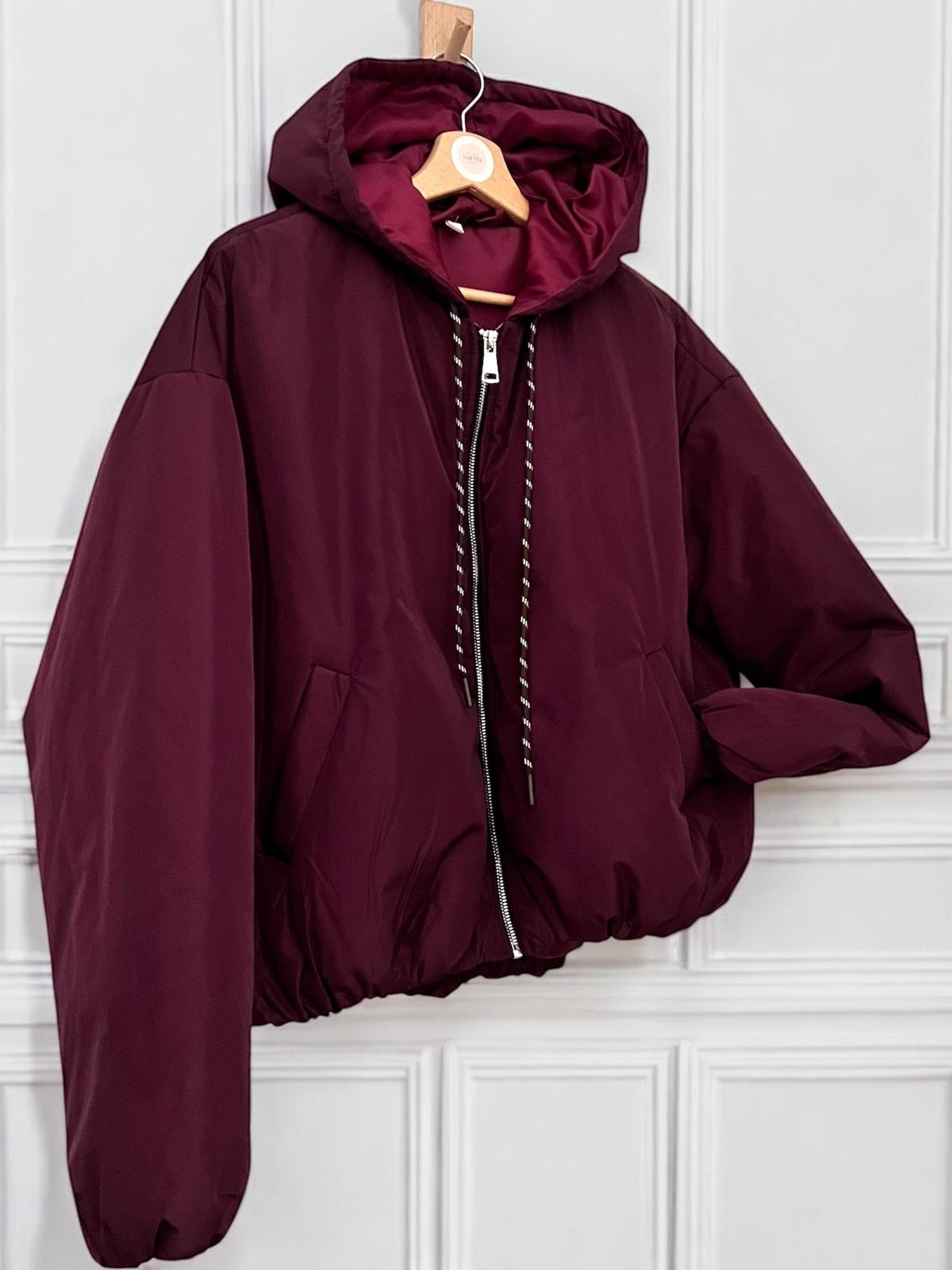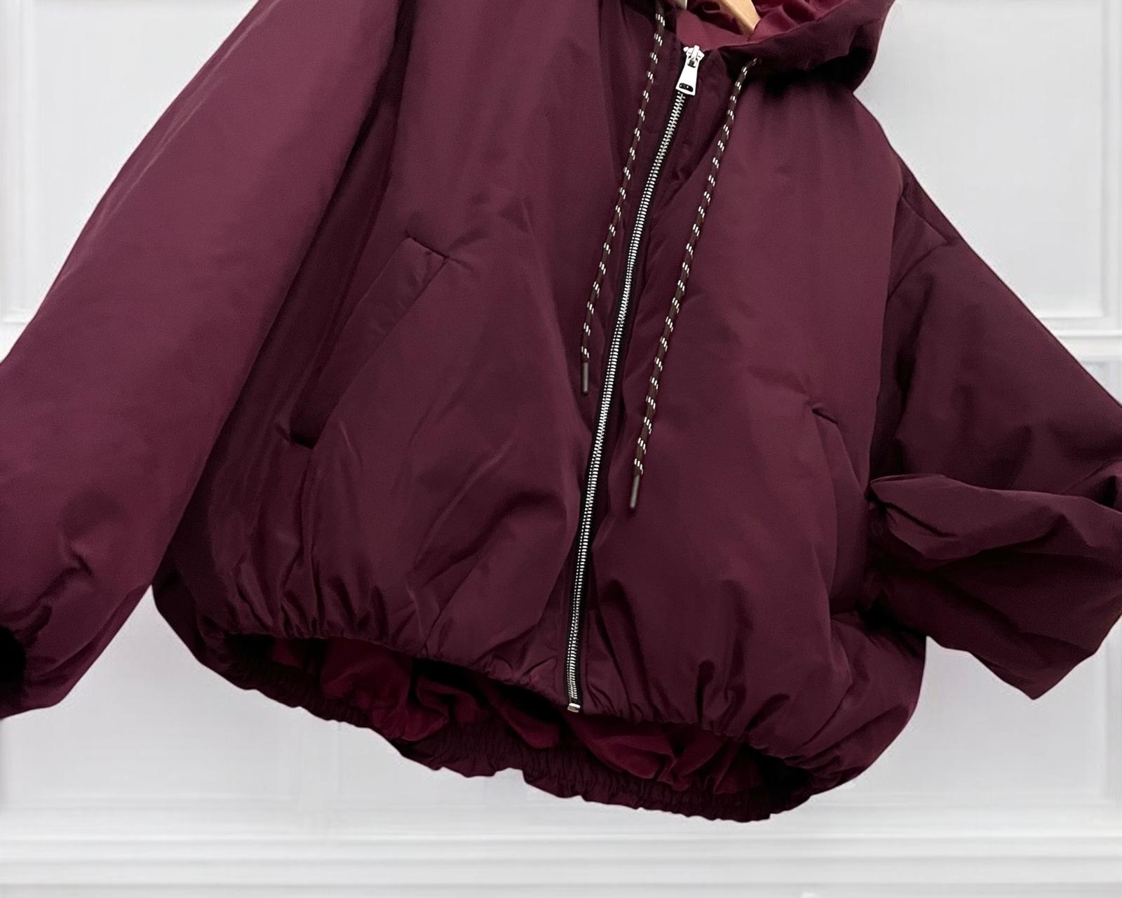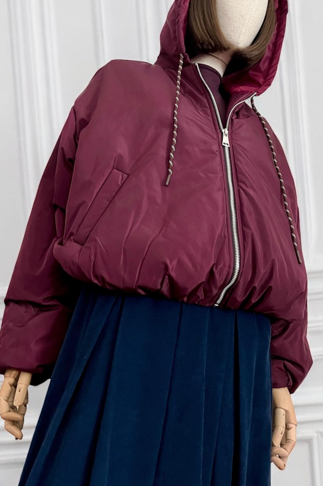Bomber imbottito dalla vestibilità over. Chiusura con zip e coulisse al collo. Cappuccio ampio e comodo. Arricciato sul fondo. U n capo comodo e alla moda. Adatto ad ogni fisicità Misure: Lunghezza totale 59 cm Torace 64 cm