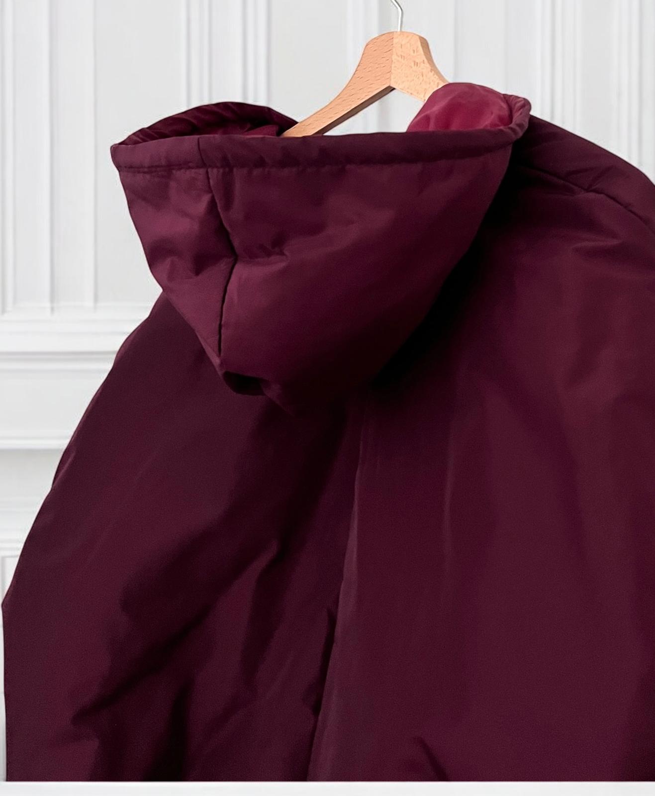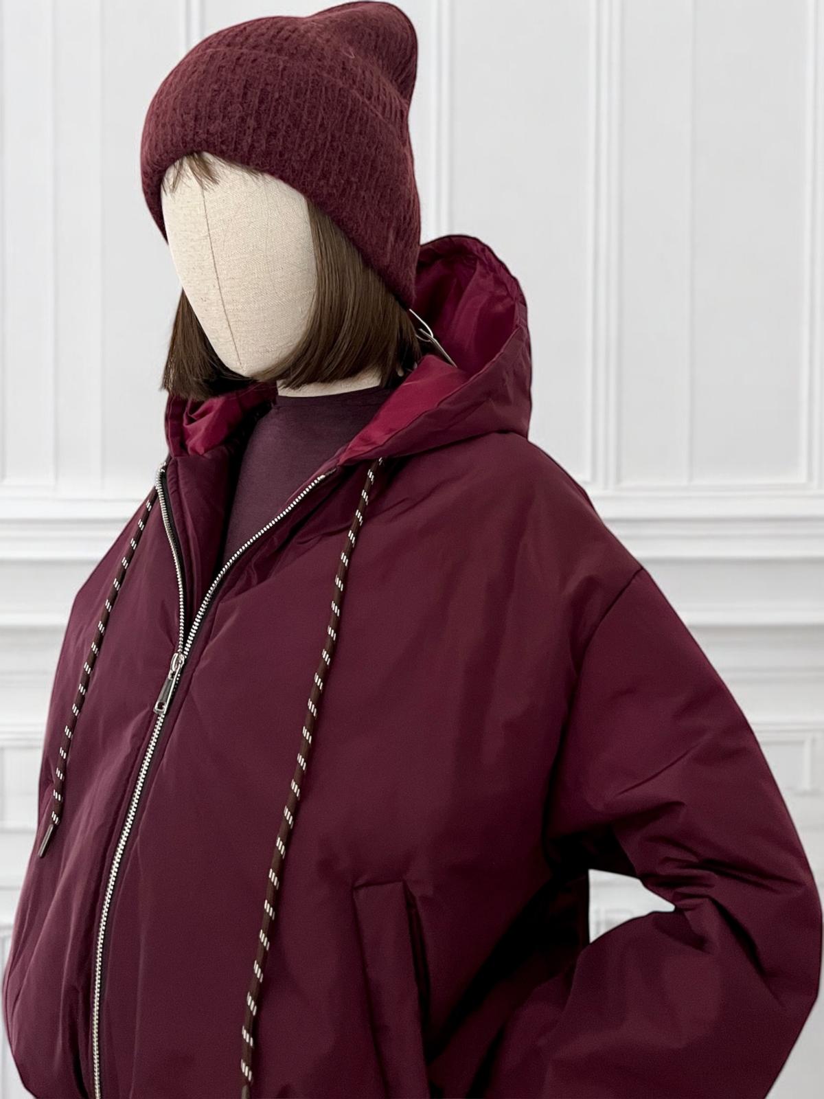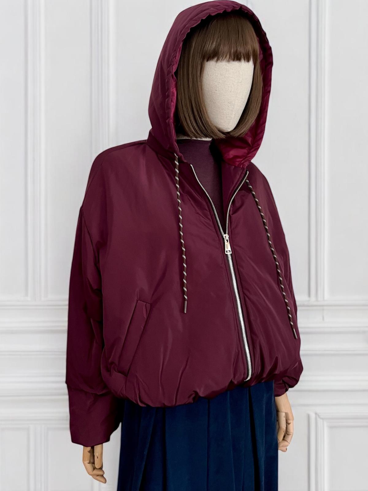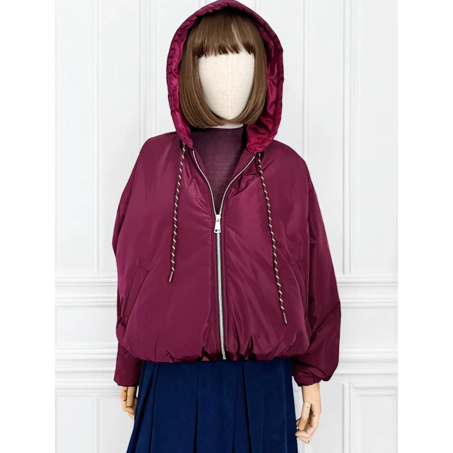 Bomber imbottito dalla vestibilità over. Chiusura con zip e coulisse al collo. Cappuccio ampio e comodo. Arricciato sul fondo. U n capo comodo e alla moda. Adatto ad ogni fisicità Misure: Lunghezza totale 59 cm Torace 64 cm