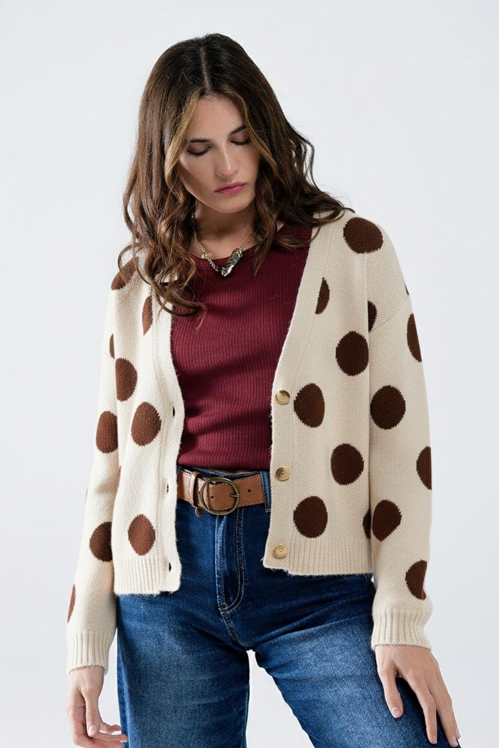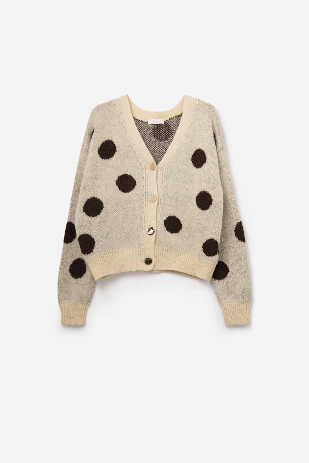 Cardigan color crema a pois marroni. Scollo a V e vestibilità basica. I bottoni dorati impreziosiscono il capo rendendolo unico.