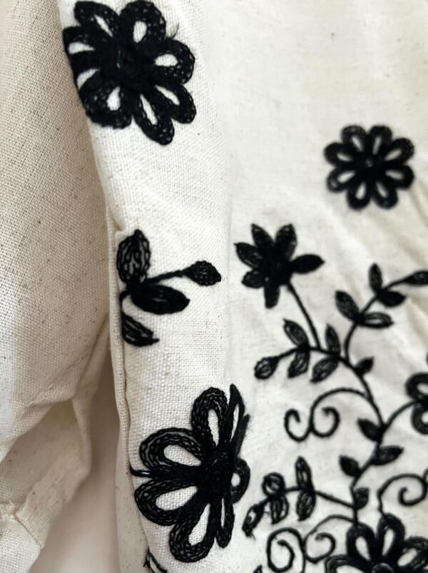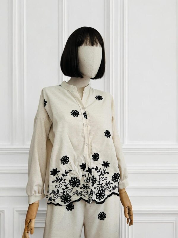 Coordinato in misto lino e viscosa con ricami in filato nero. Camicia dalla linea diritta con collo alla coreana e fondo leggermente stondato. Pantalone dalla linea diritta con tasche laterali e comodo elastico sul retro vita. Il manichino è alto 176cm e indossa la taglia s
