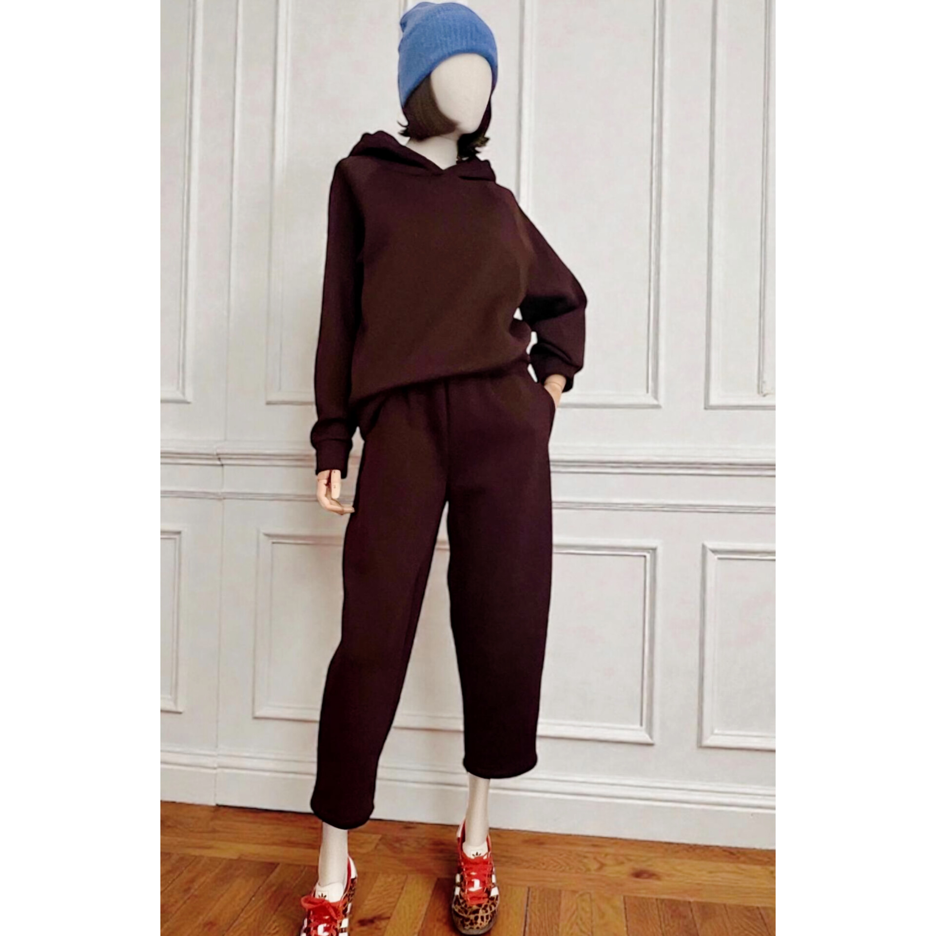Coordinato felpa e pantalone in morbido cotone felpato. Pantalone dal modello leggermente a ballon, ha un comodo elastico in vita e tasche laterali mentre la felpa ha una linea diritta e un ampio cappuccio. Tessuto caldo. Il manichino è alto 176 cm. Misure: lunghezza totale pantalone: 93 cm Vita a riposo 36 cm Lunghezza totale felpa 60 cm Giro fianco 50 cm