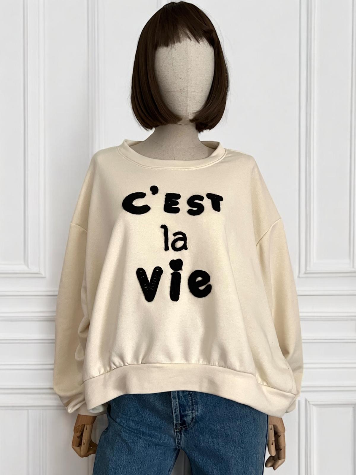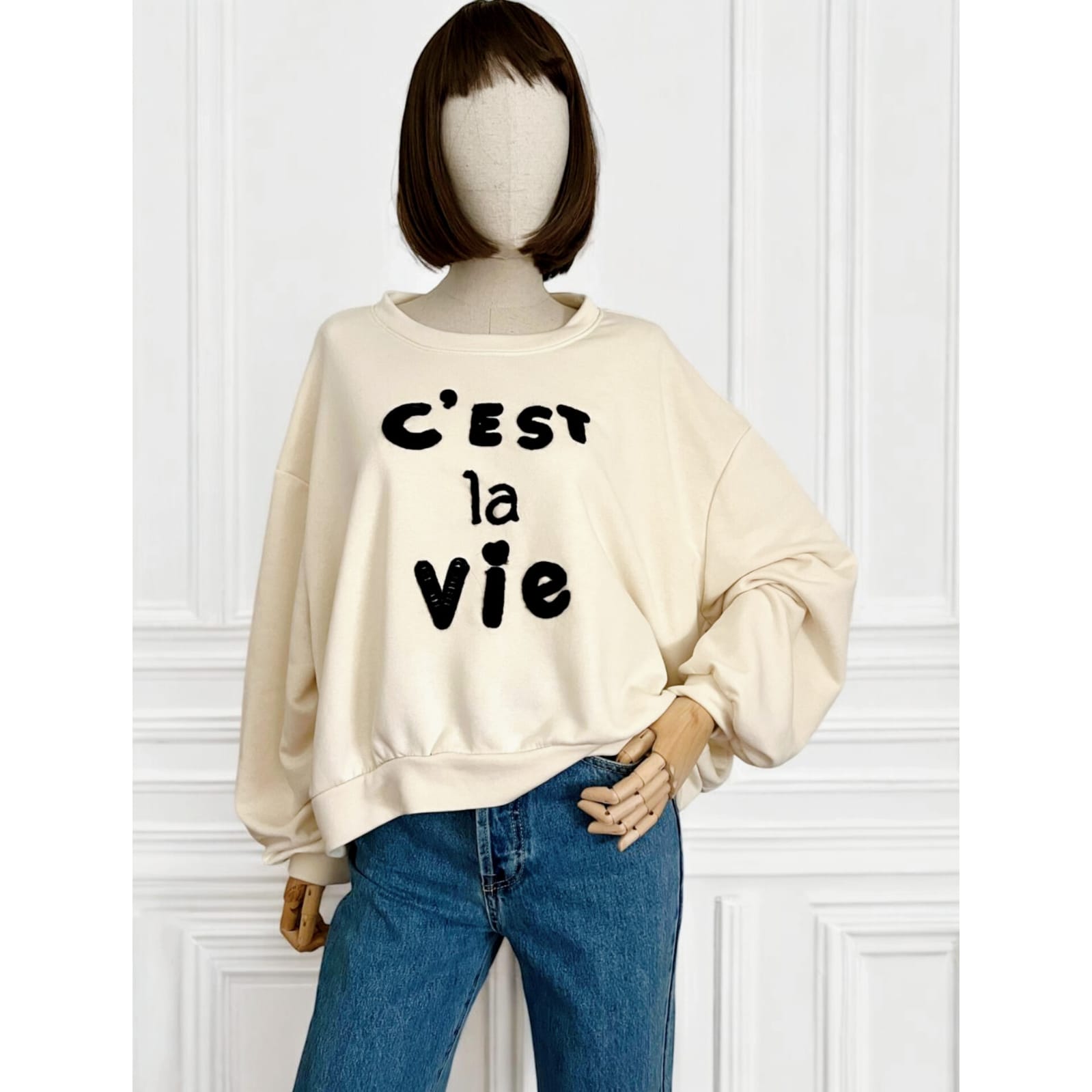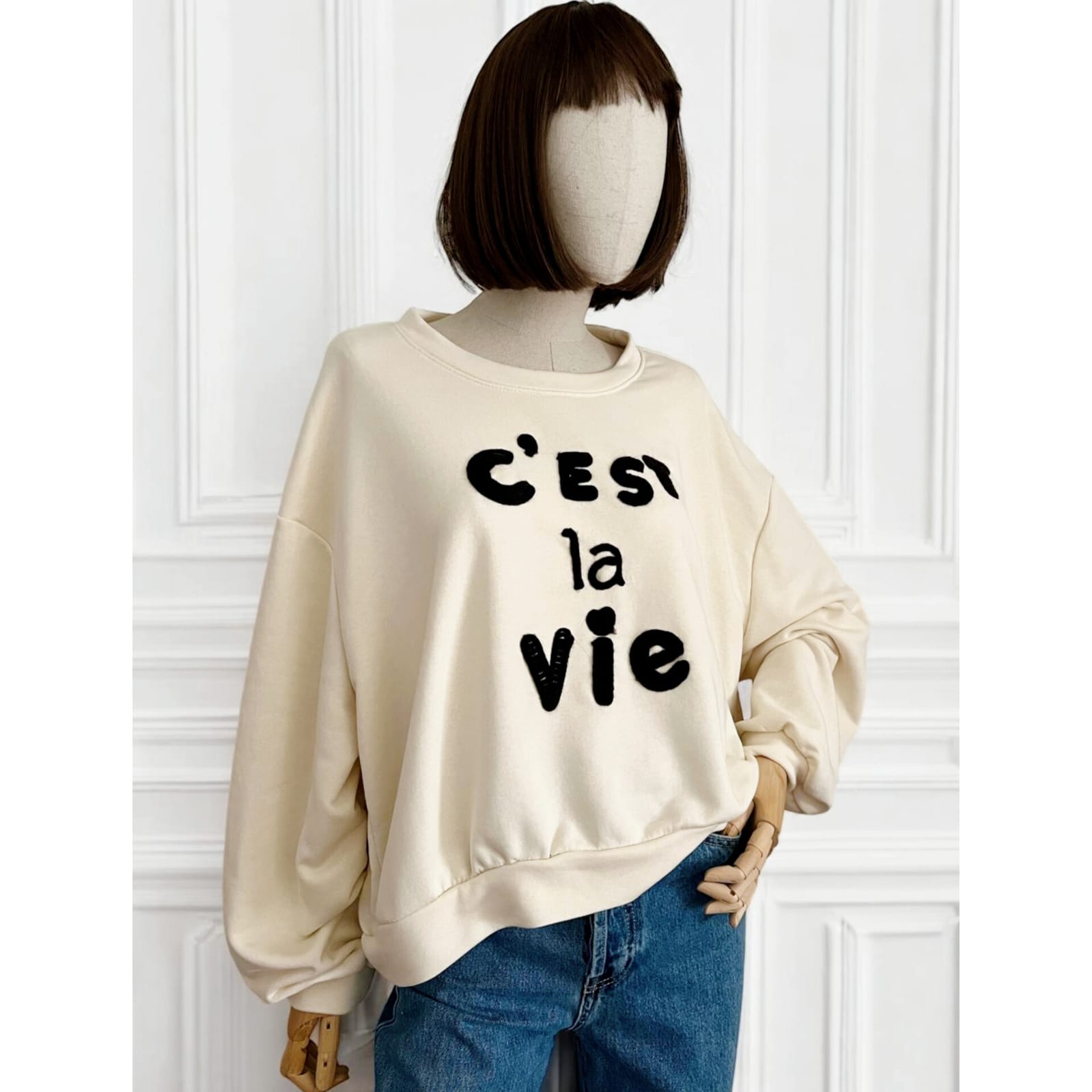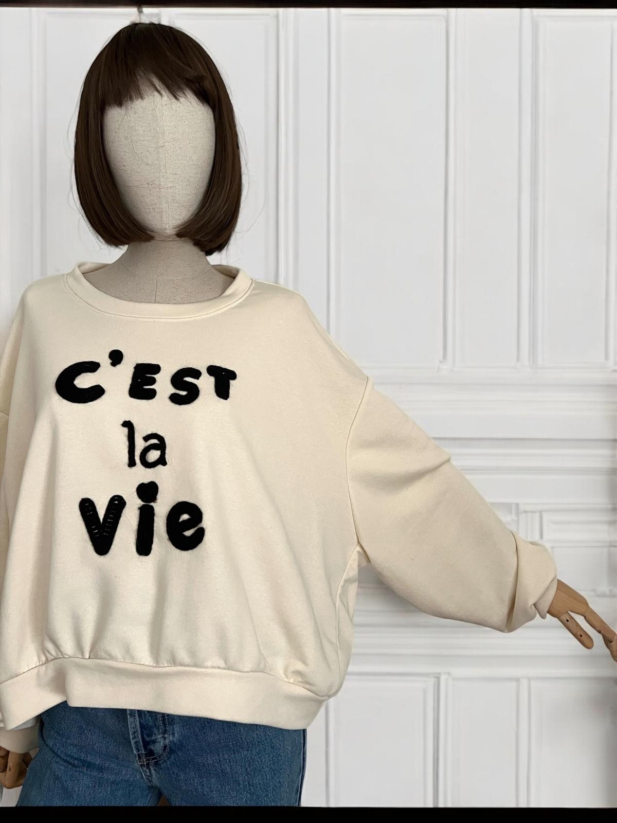 Felpa garzata modello oversize con scritta ricamata a contrasto. Spalla scesa e manica ampia con polsino. Fondo stondato, leggermente più lunga sulla parte posteriore. Misure: Lunghezza totale 53 cm Torace ampio