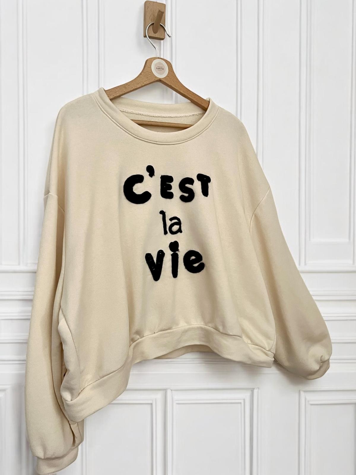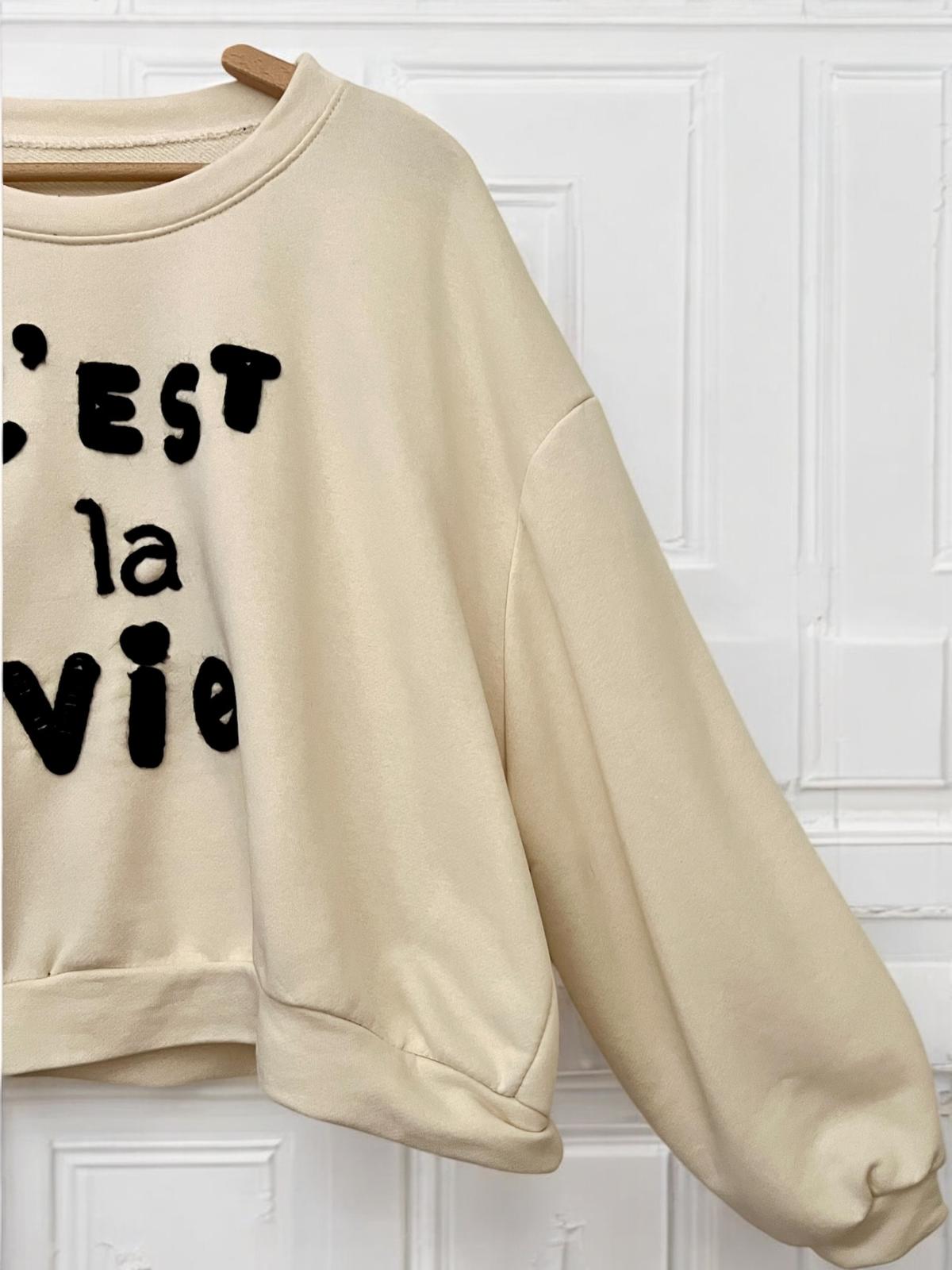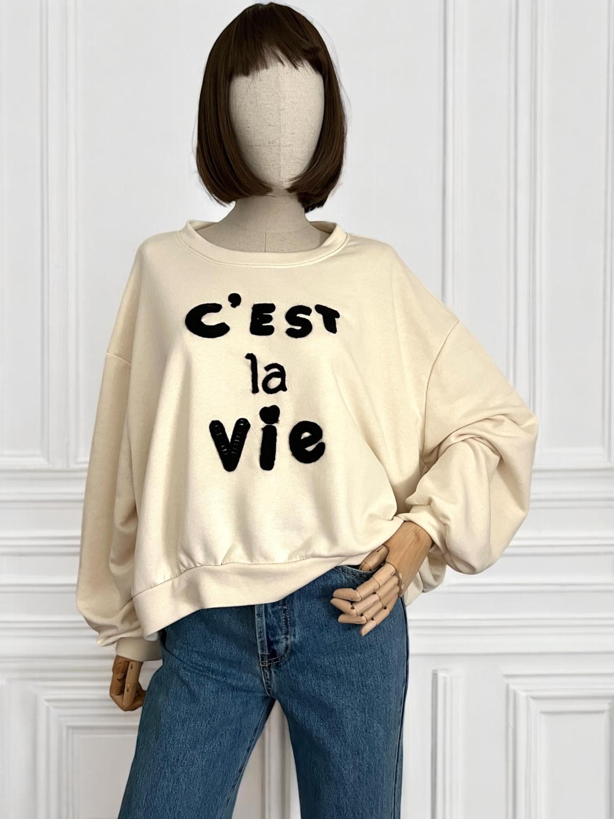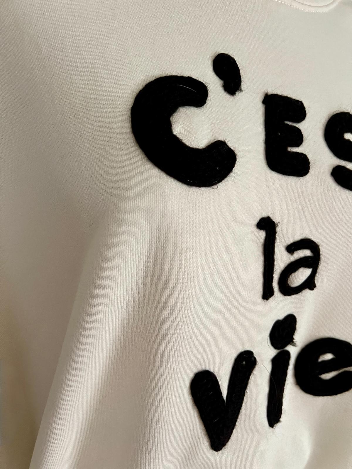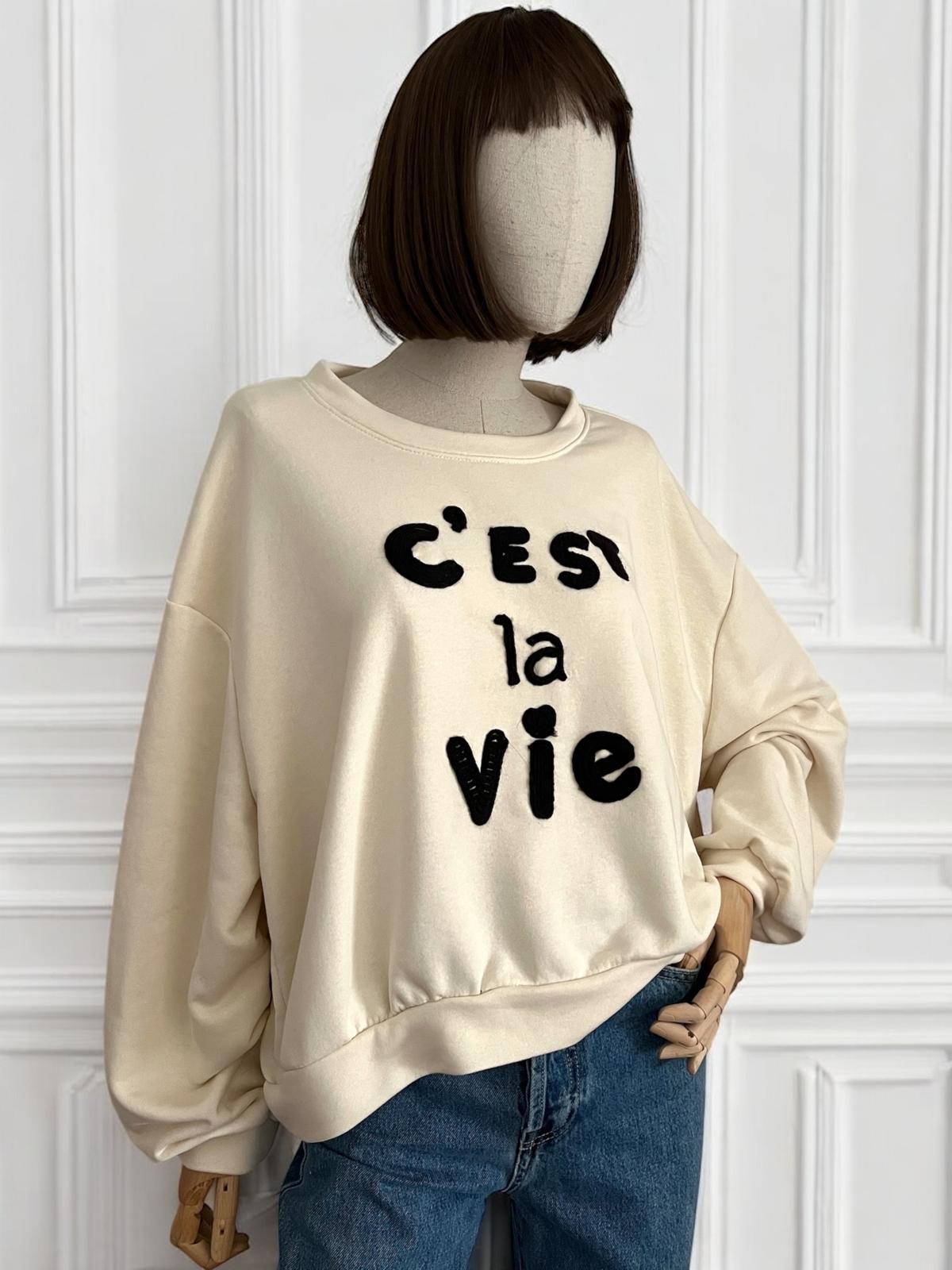 Felpa garzata modello oversize con scritta ricamata a contrasto. Spalla scesa e manica ampia con polsino. Fondo stondato, leggermente più lunga sulla parte posteriore. Misure: Lunghezza totale 53 cm Torace ampio