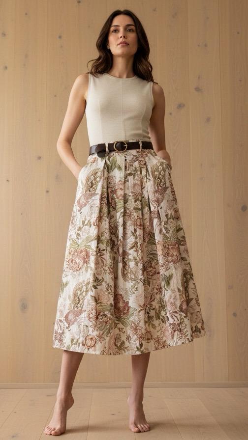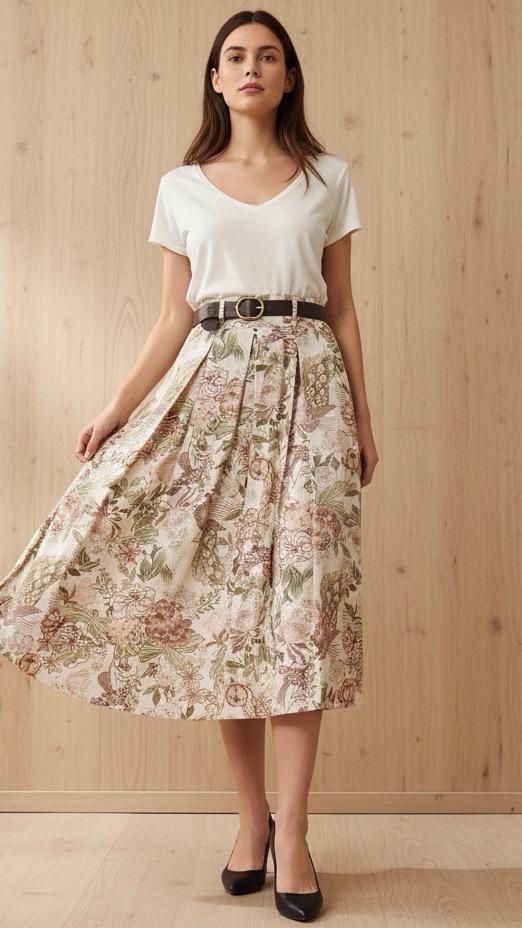 Gonna Midi in cotone sostenuto con stampa. Vita alta ed elastico sul retro vita. Cintura in ecopelle inclusa