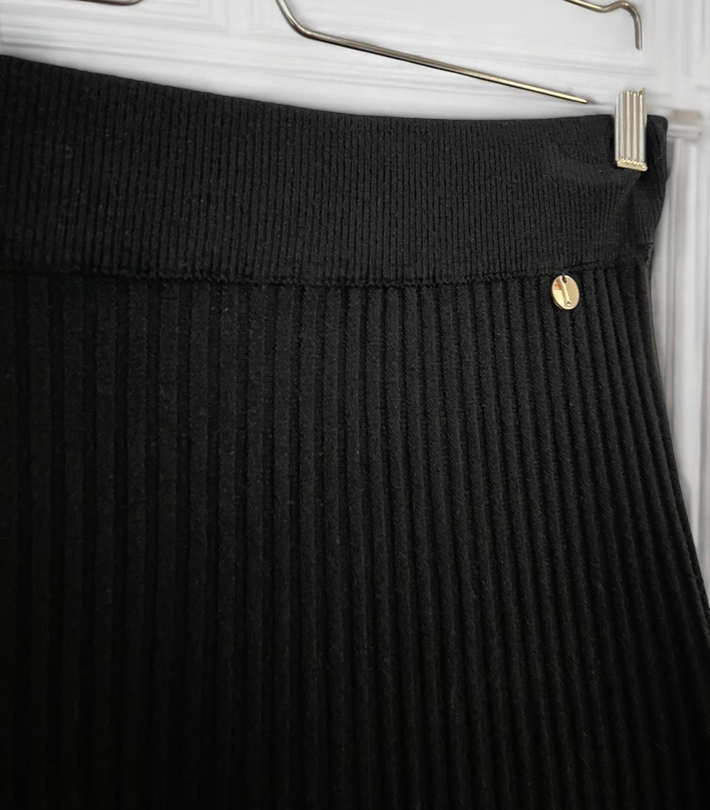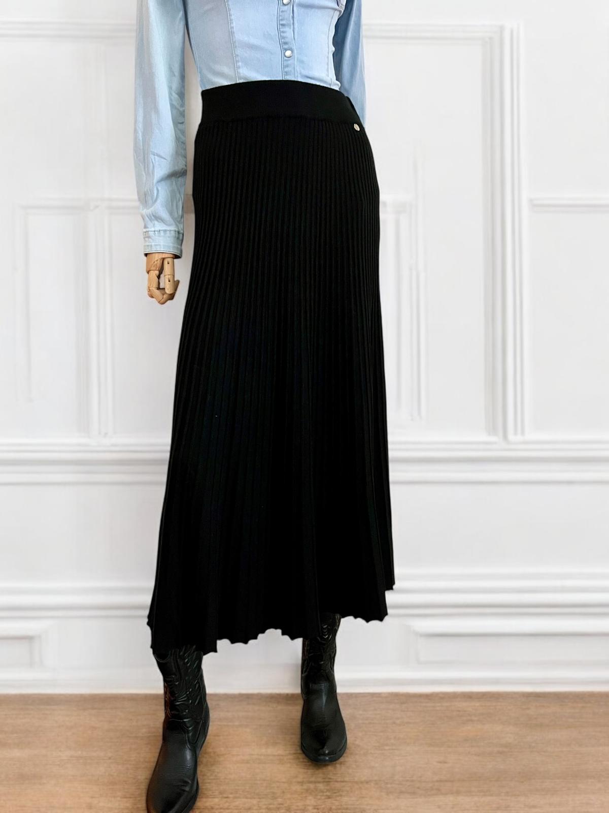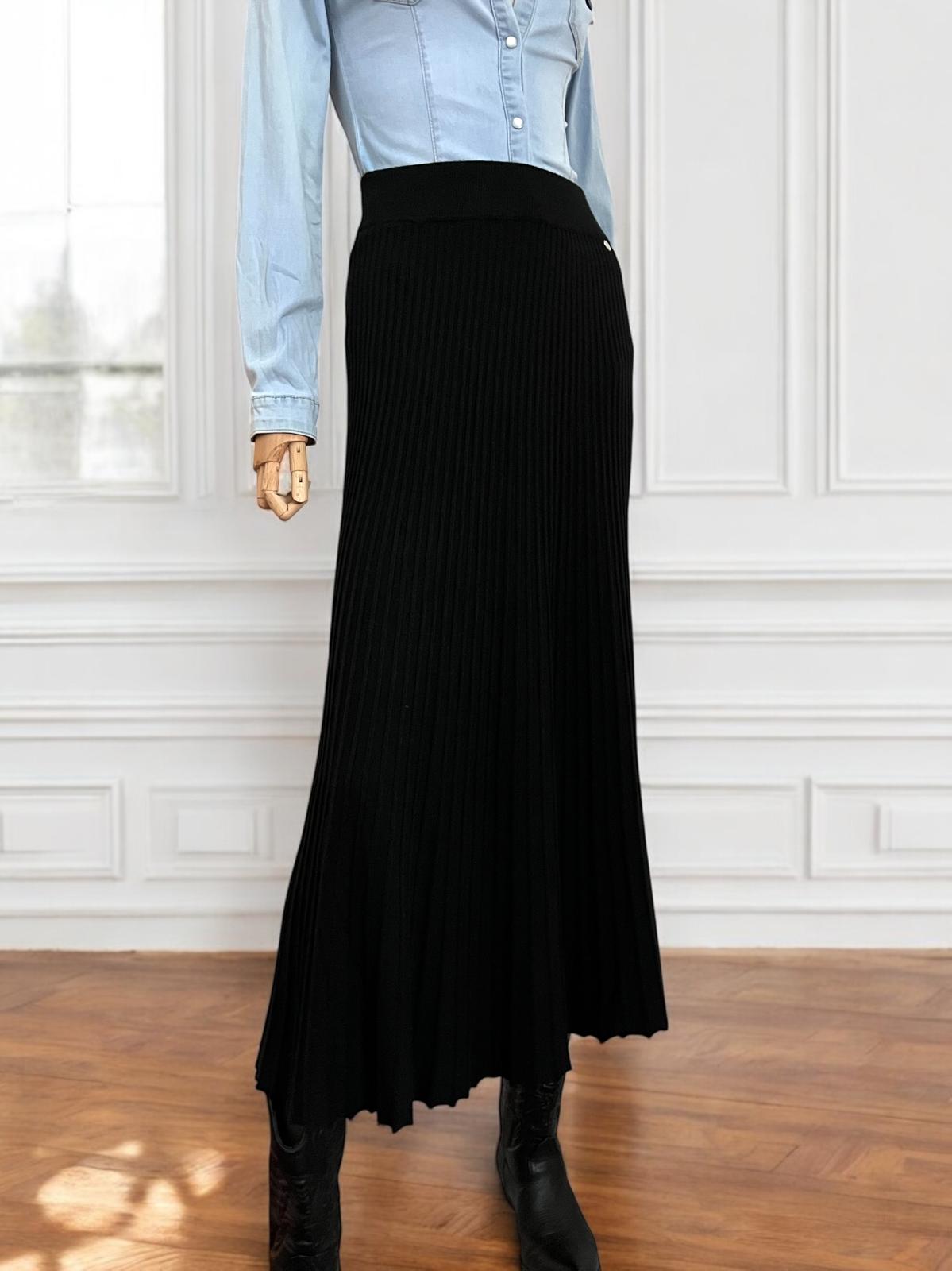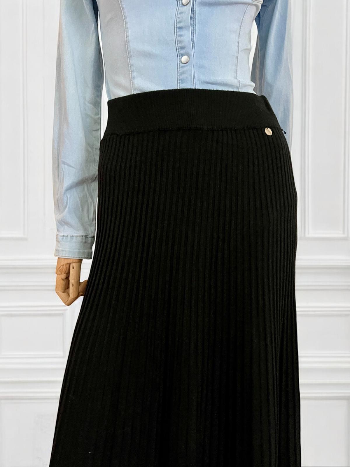 Gonna in maglia plissettata con comoda vita elasticata. Sui fianchi rimane più aderente per scendere più ampia dal fianco in giù. Comoda e versatile, si adatta ad ogni outfit. Il manichino è alto 176 cm Misure: Girovita a riposo: 33 cm Lunghezza totale 90 cm