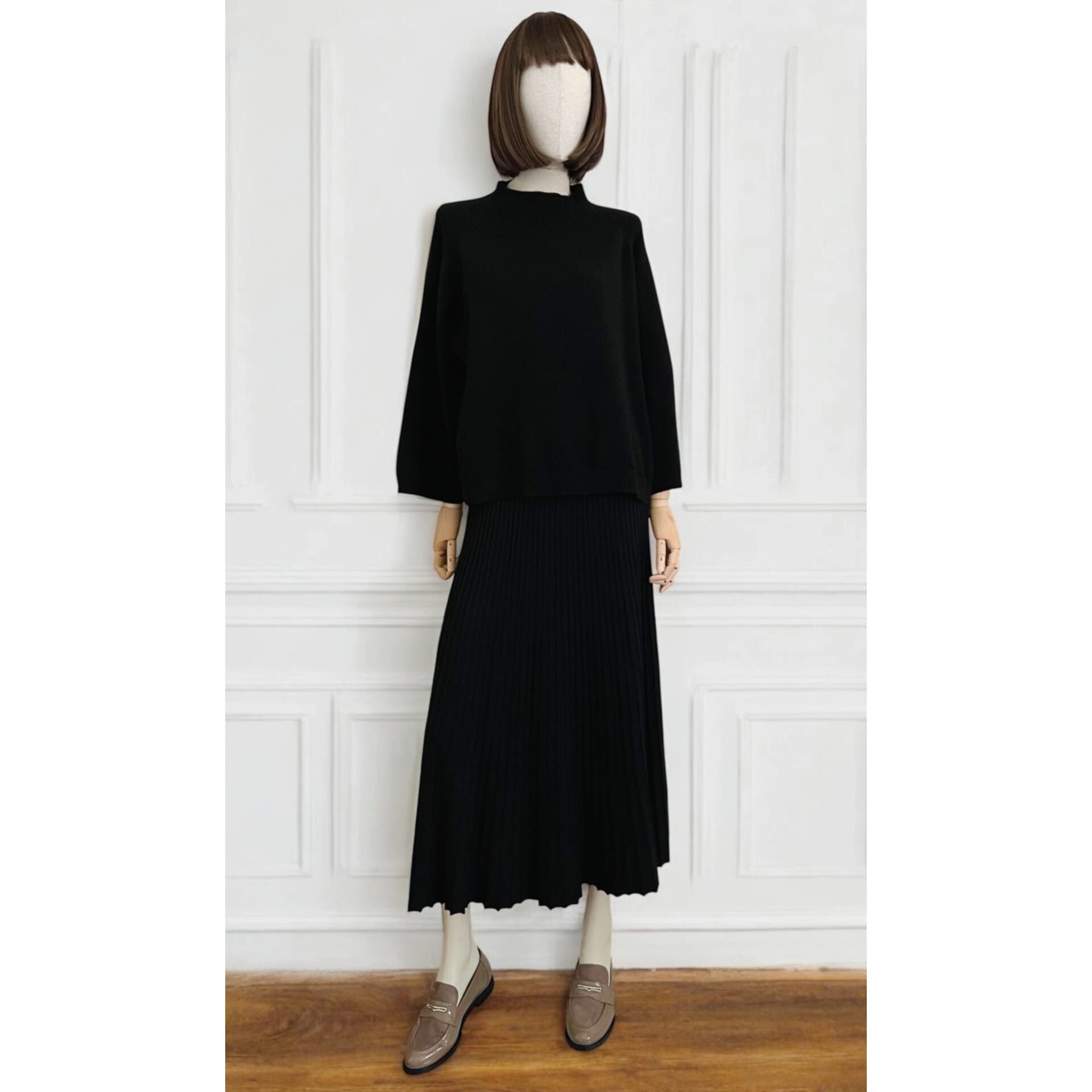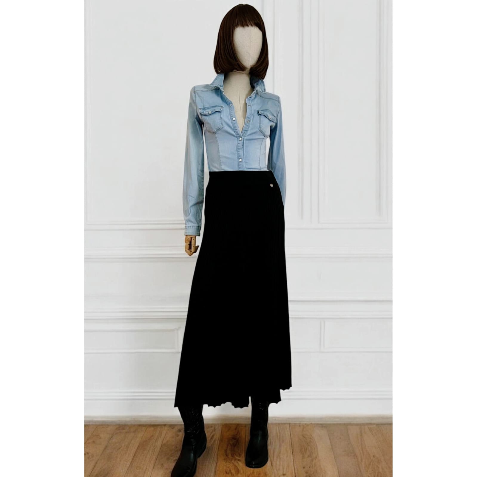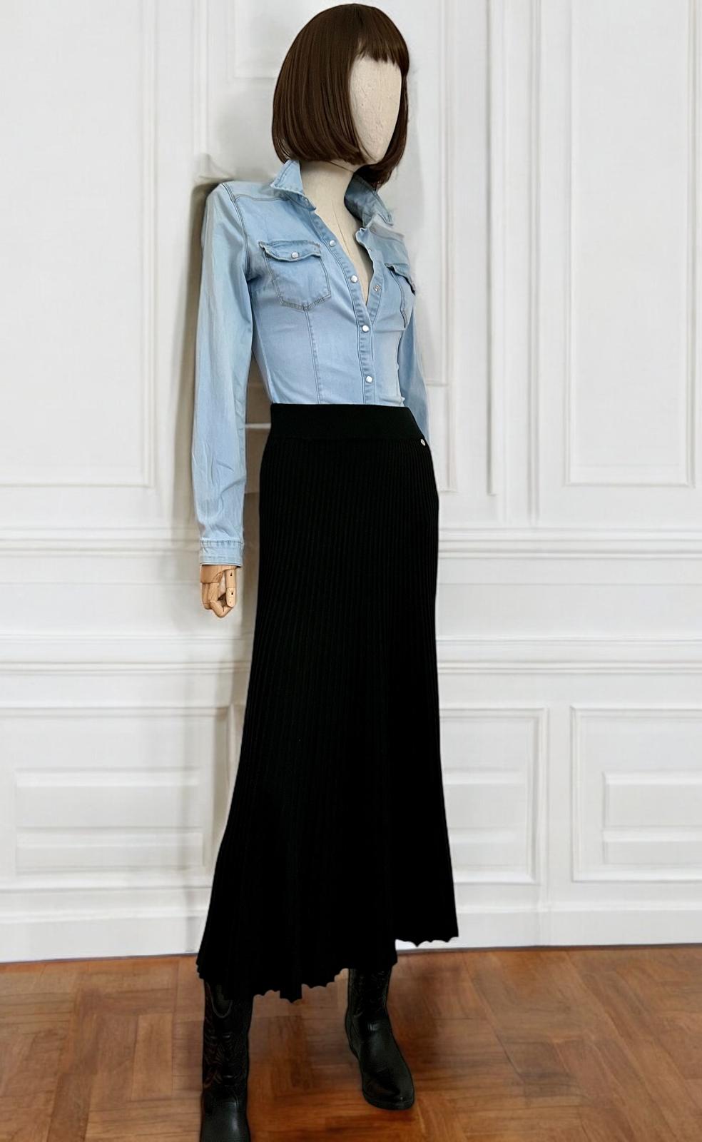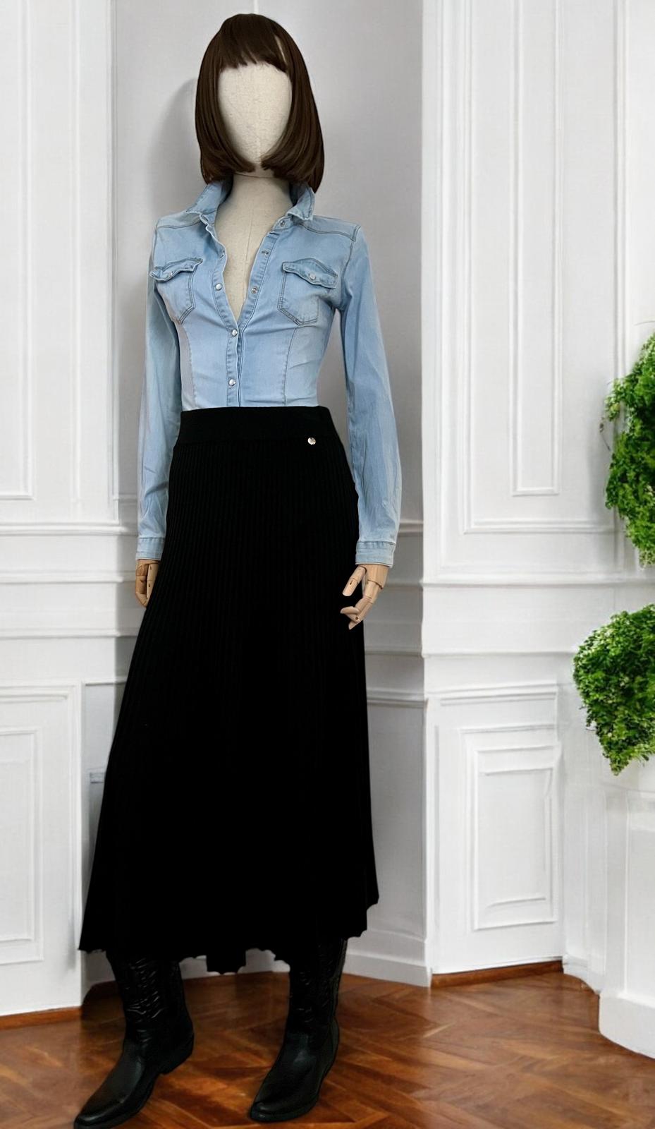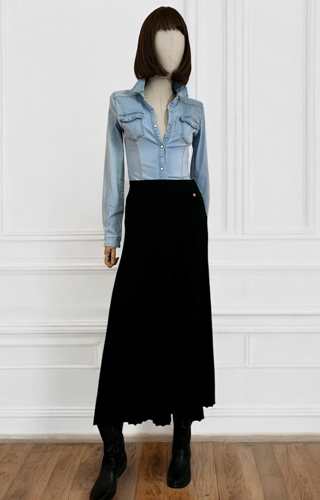Gonna in maglia plissettata con comoda vita elasticata. Sui fianchi rimane più aderente per scendere più ampia dal fianco in giù. Comoda e versatile, si adatta ad ogni outfit. Il manichino è alto 176 cm Misure: Girovita a riposo: 33 cm Lunghezza totale 90 cm