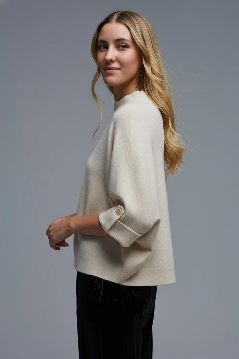 Maglione a girocollo e maniche a tre quarti, perfetto per ogni occasione. I dettagli dei bottoni sulle maniche aggiungono un tocco di stile rendendo questo capo un must-have per il vostro guardaroba