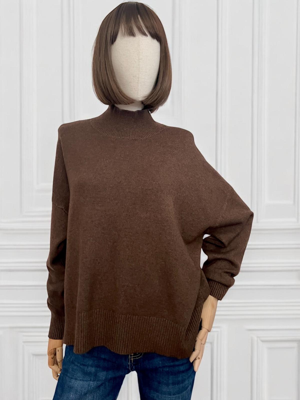 Maglia in tessuto rasato morbido e caldo con collo a lupetto. Linea diritta con spacchi laterali. La parte posteriore è più lunga. Spalla leggermente scesa. Il manichino è alto 176 cm. Lunghezza totale dalla parte posteriore: 68 cm