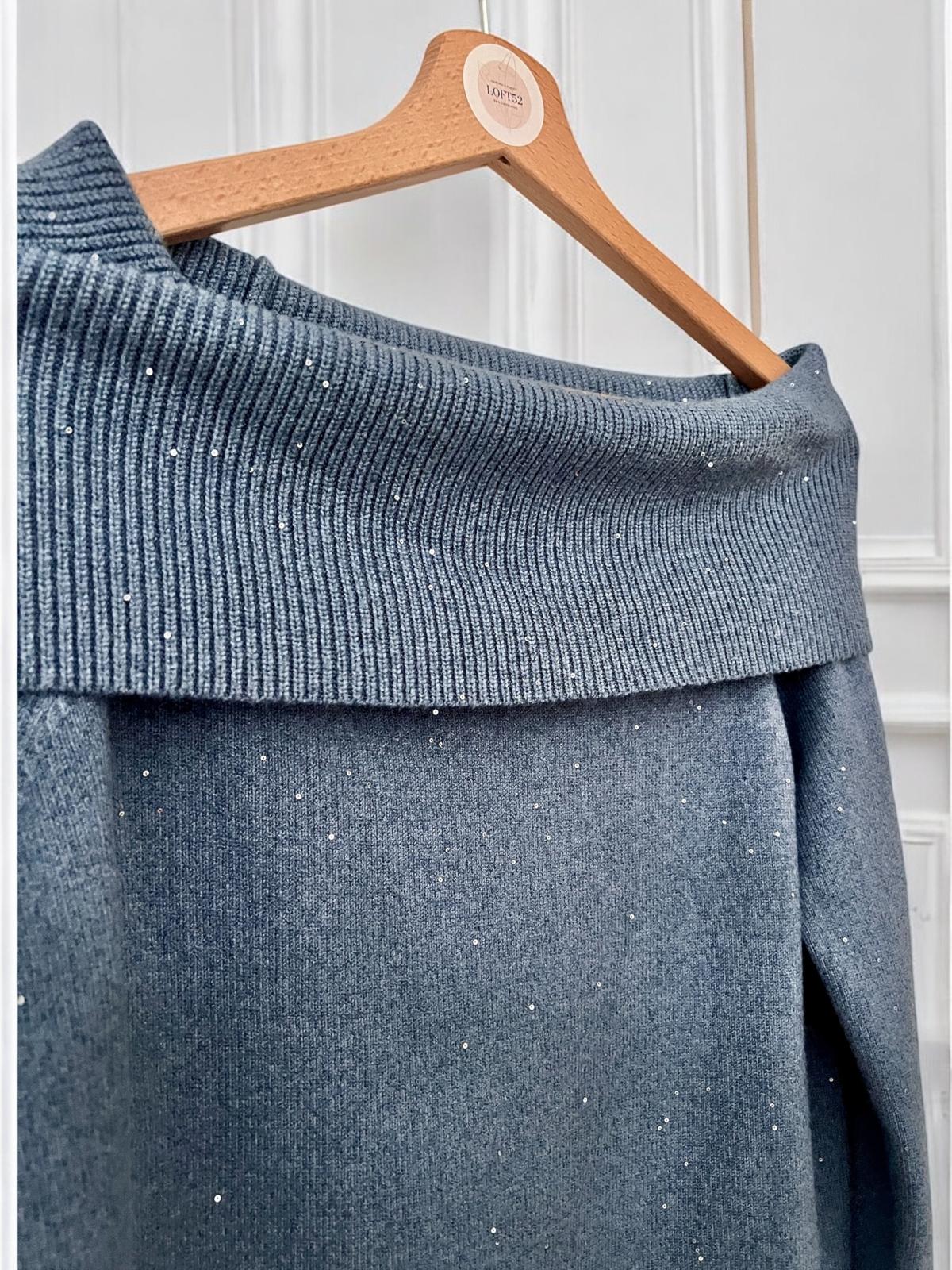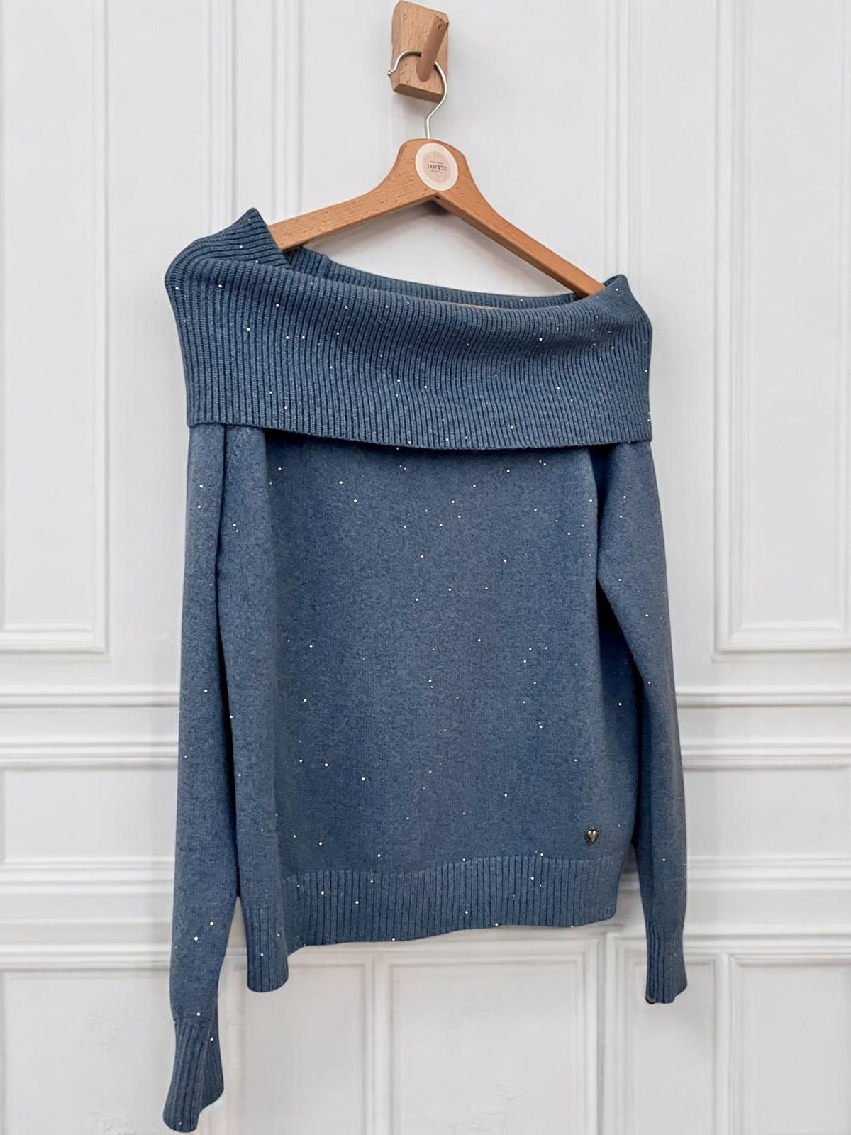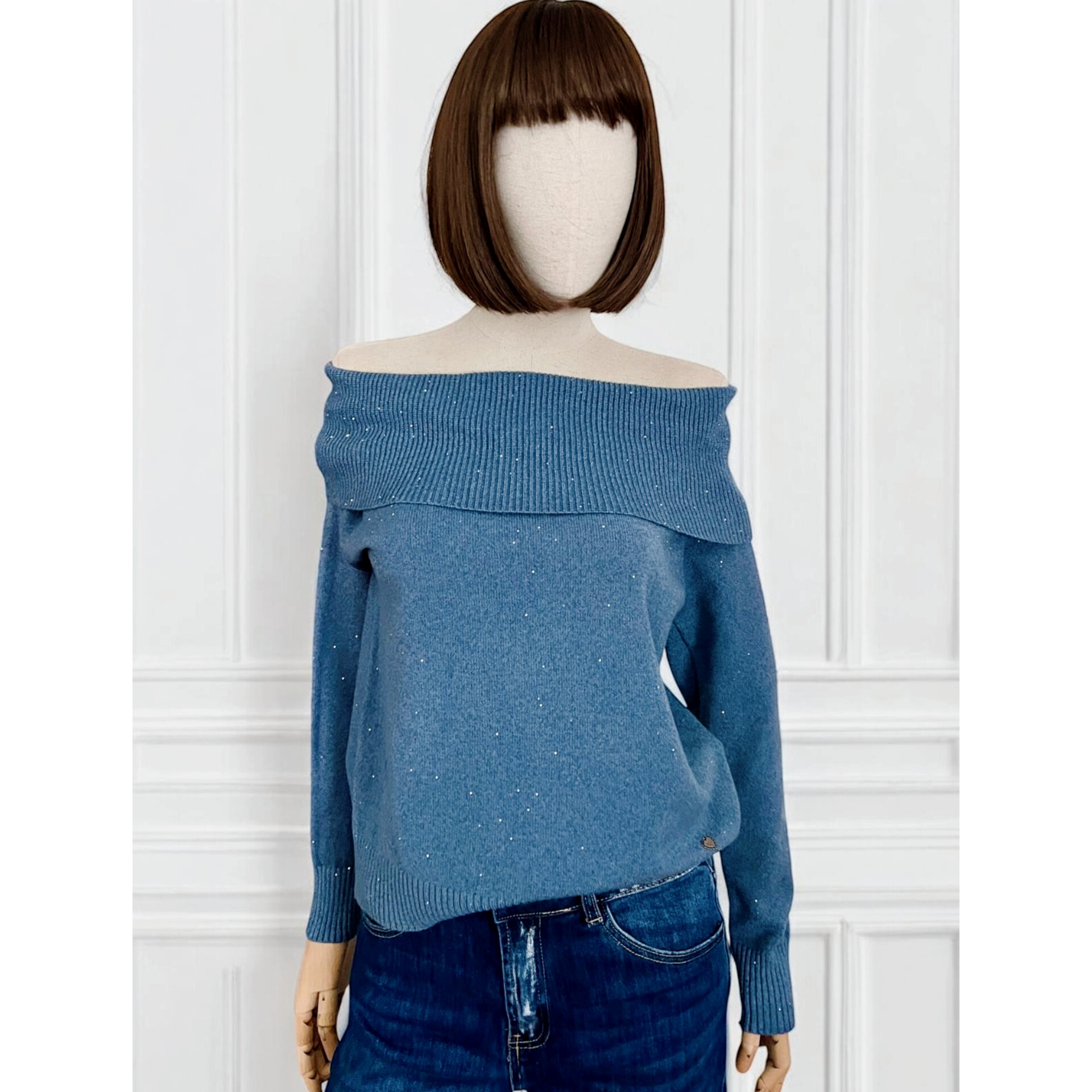 Maglia con collo shiffer in tessuto morbido ed elasticizzato. Piccoli fili di lame’ su tutto il capo che gli conferiscono luminosità e brillantezza