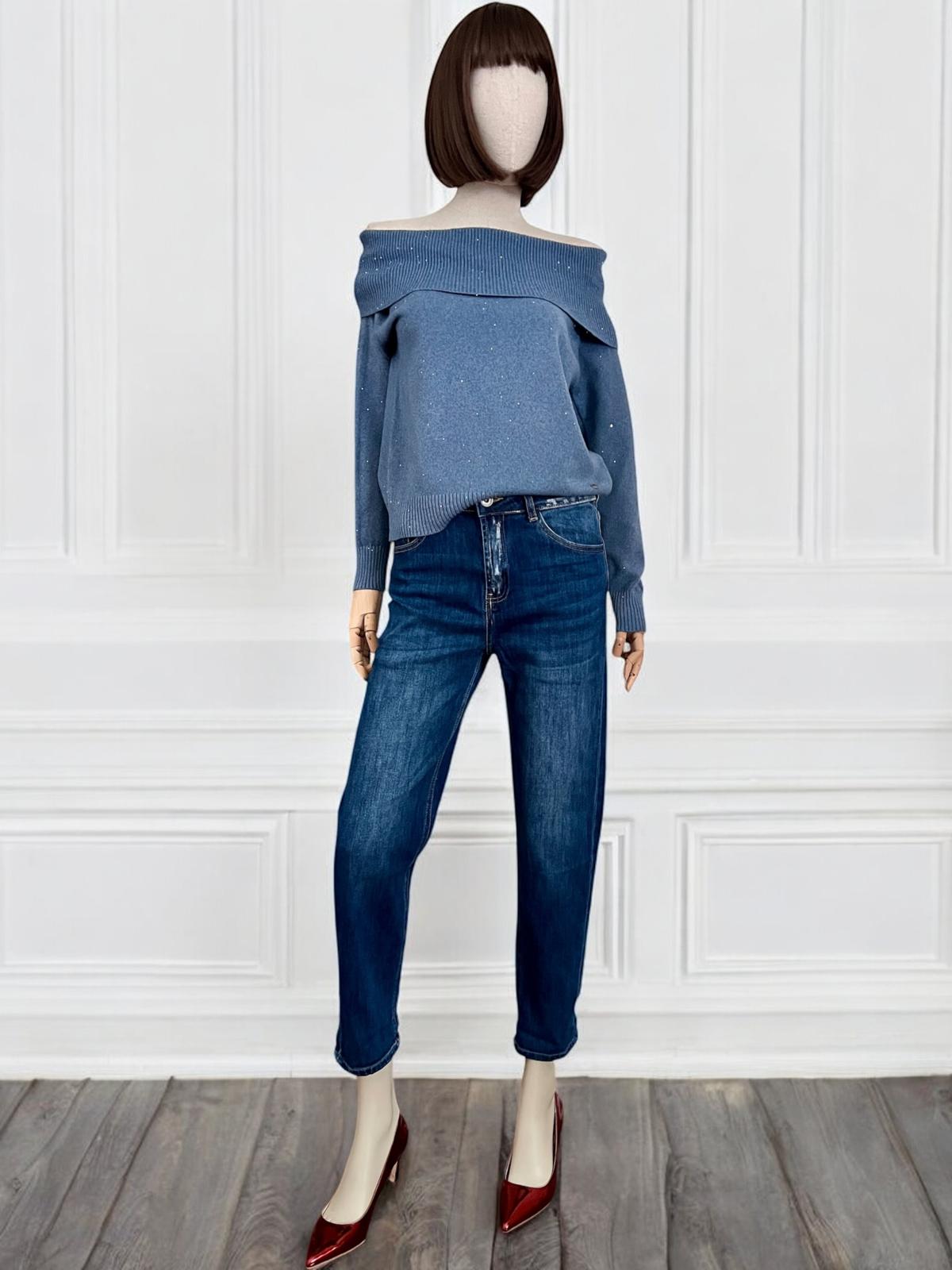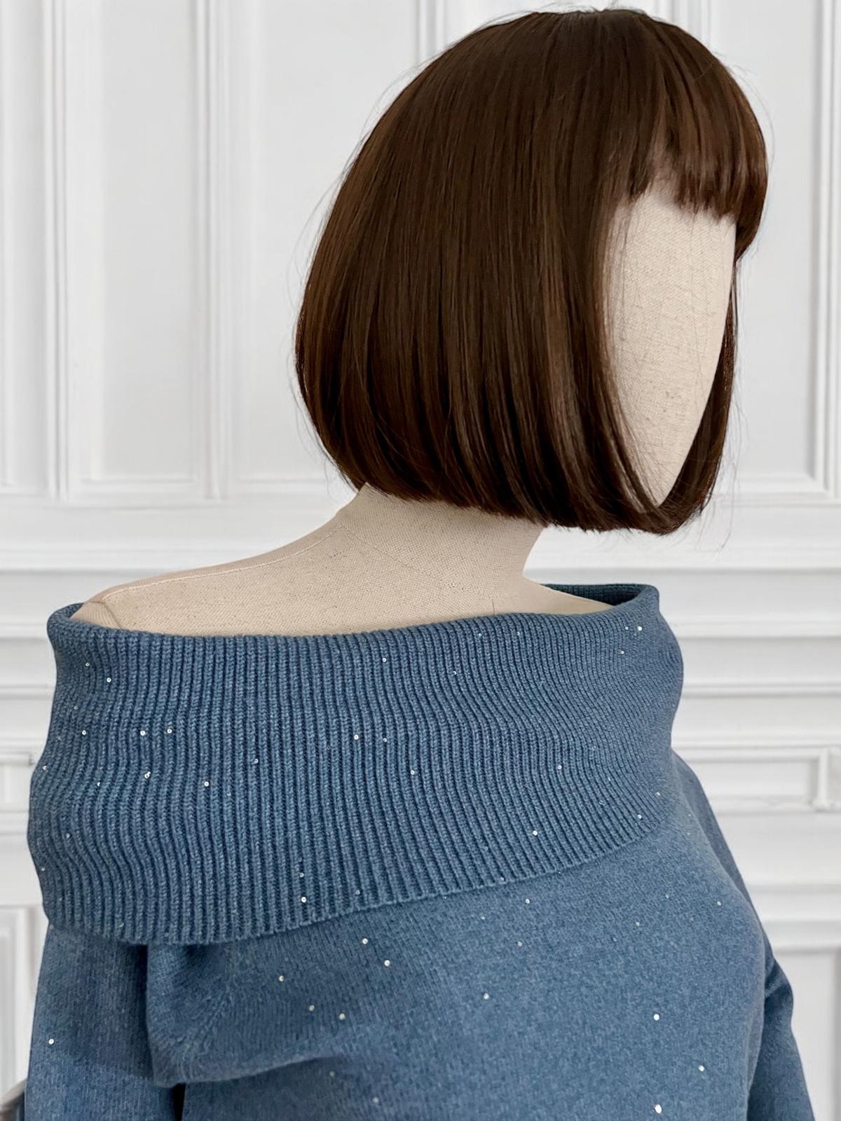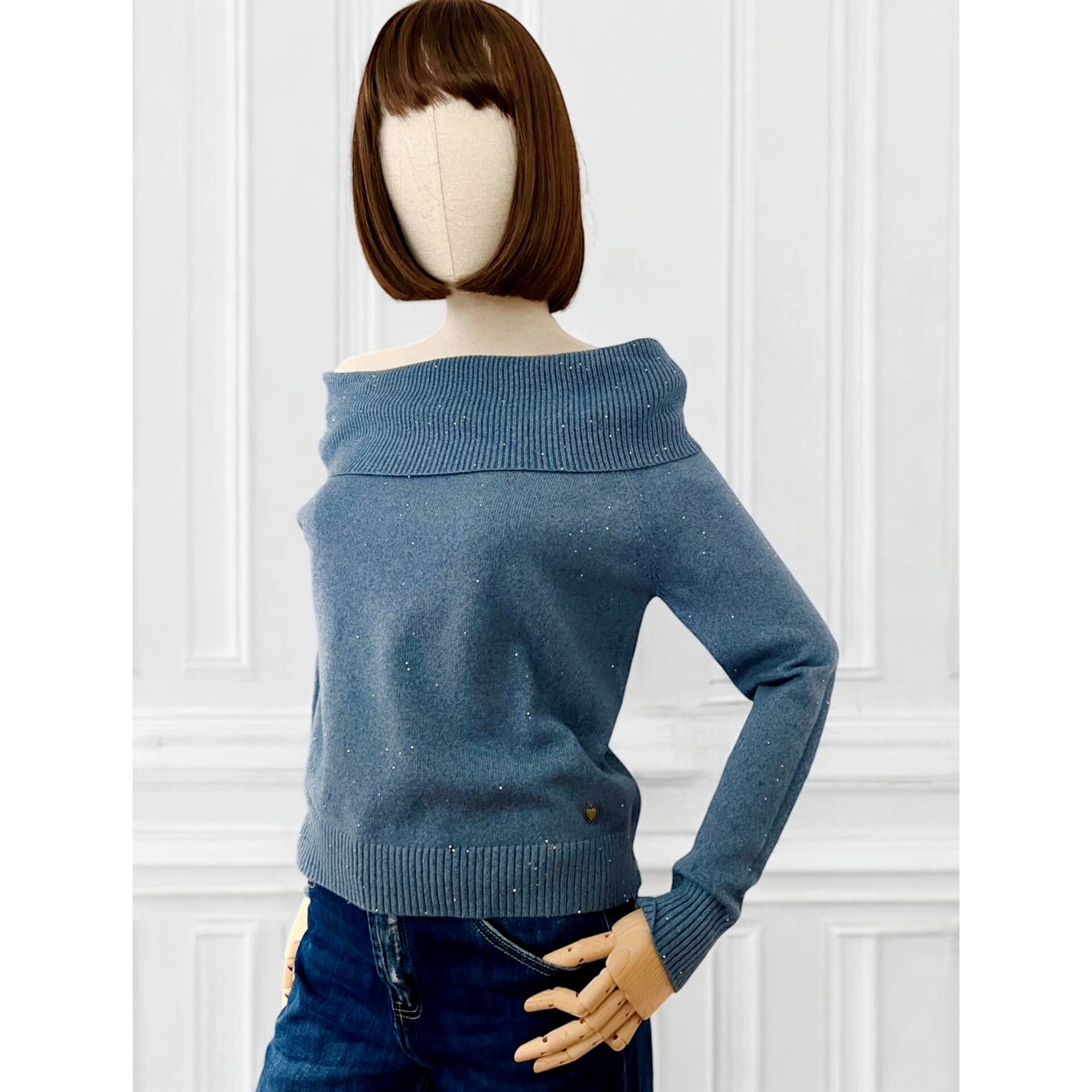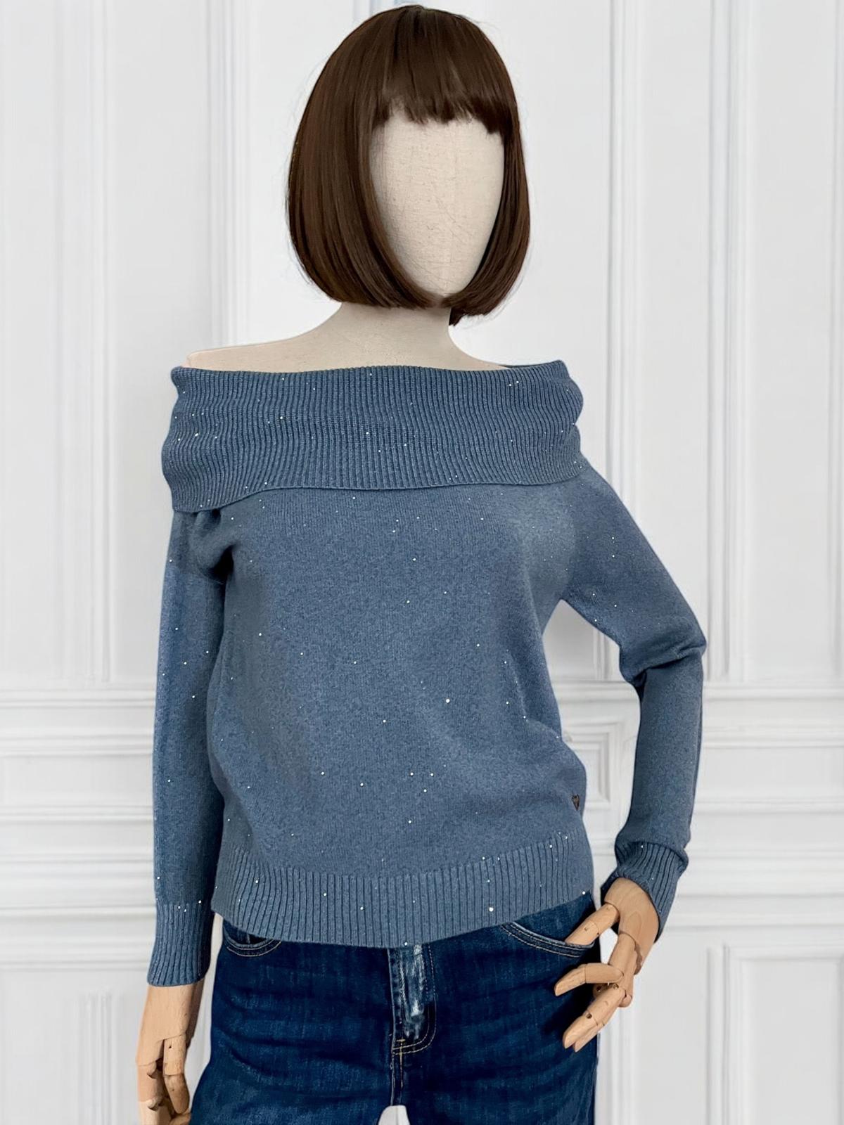 Maglia con collo shiffer in tessuto morbido ed elasticizzato. Piccoli fili di lame’ su tutto il capo che gli conferiscono luminosità e brillantezza