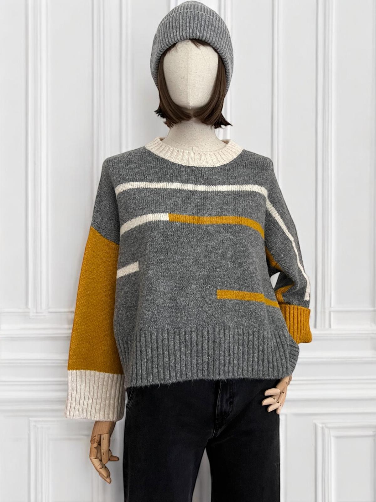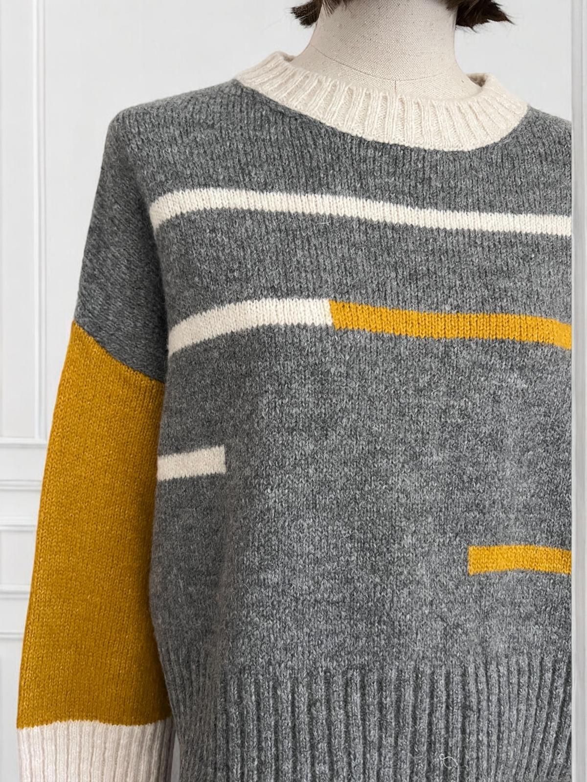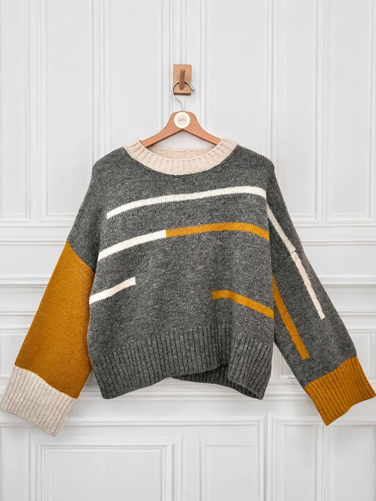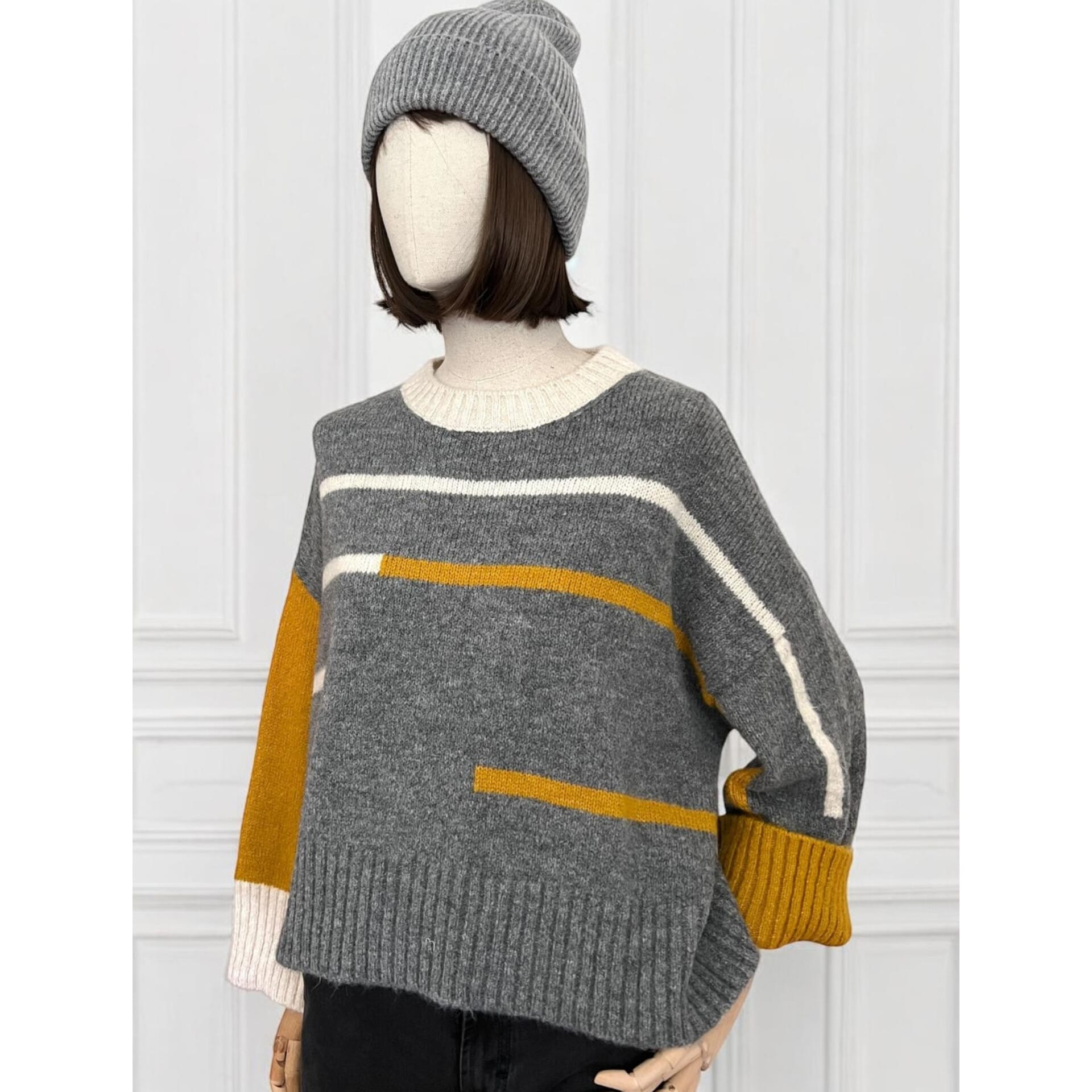 Maglione in misto lana con profili a coste. Righe a contrasto sulla parte frontale e maniche. Tessuto super morbido e caldo. Vestibilità comoda