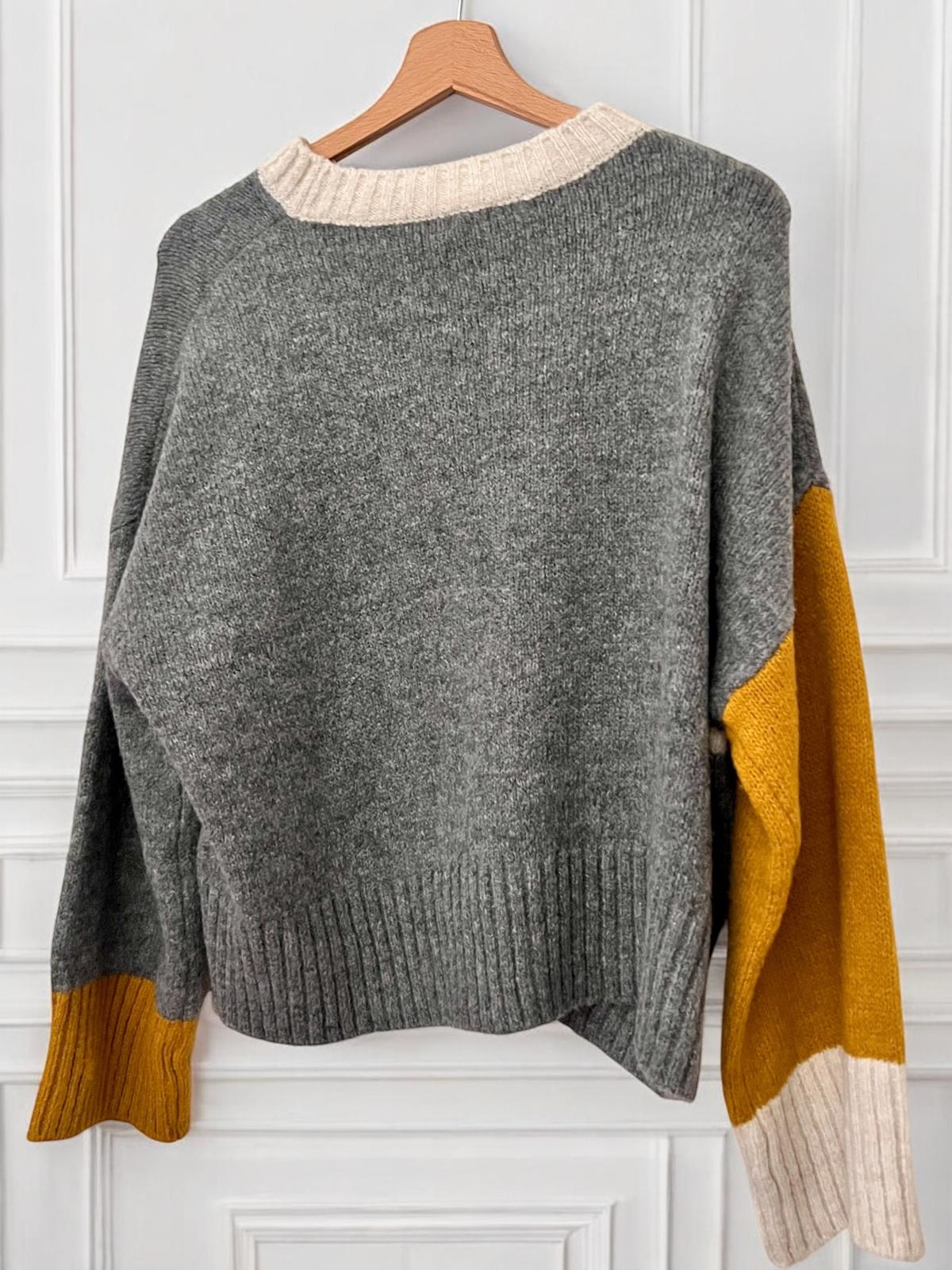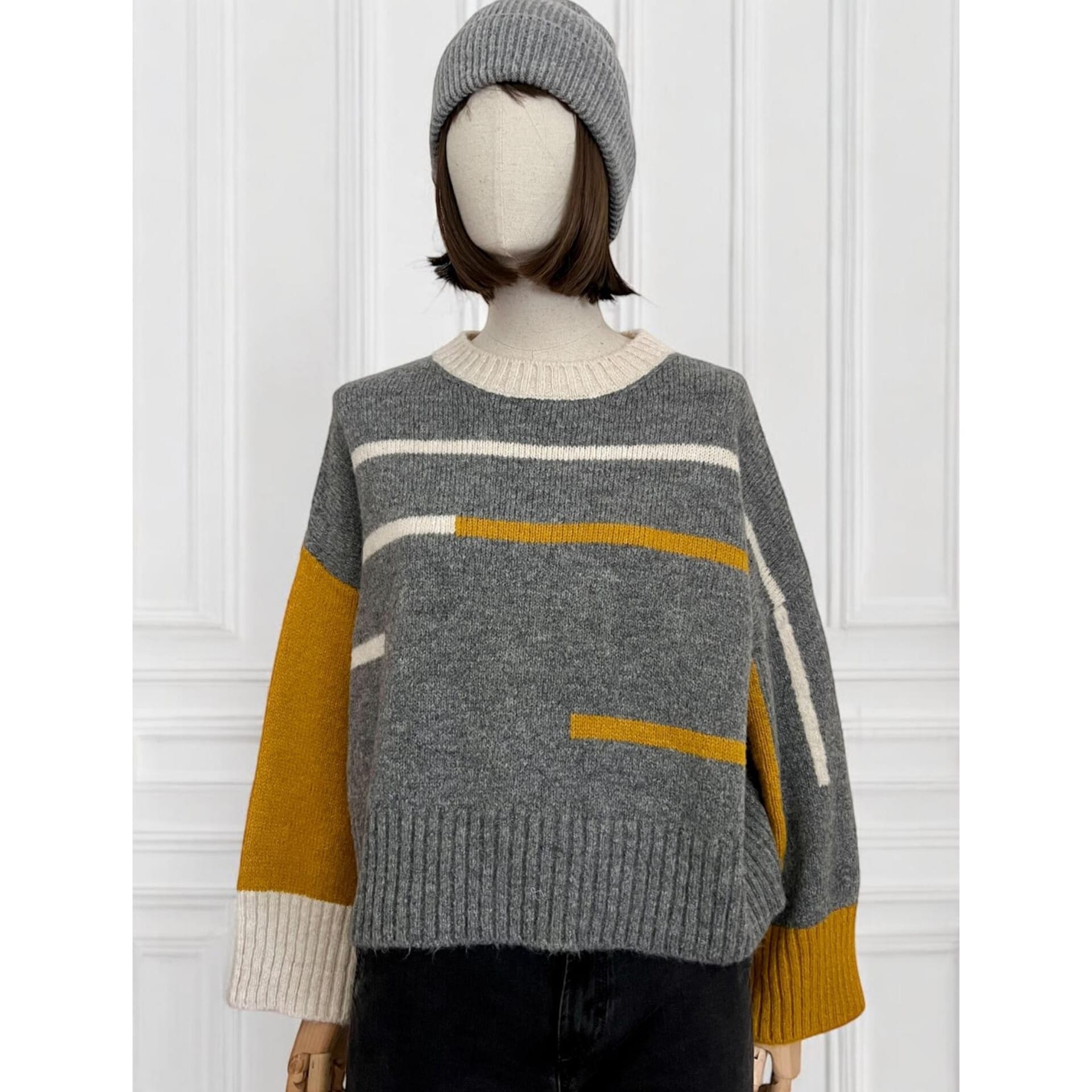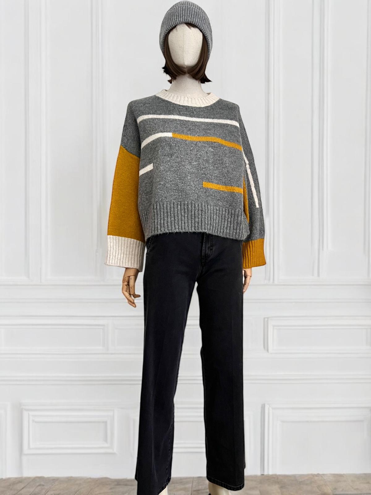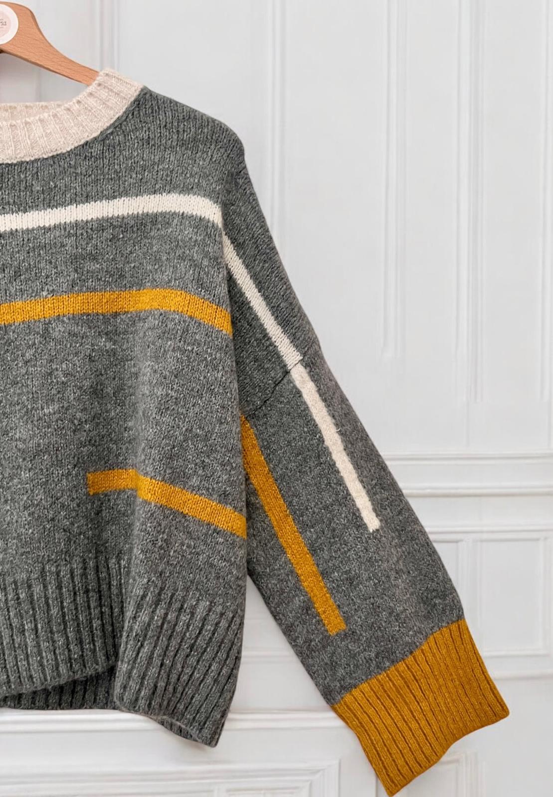 Maglione in misto lana con profili a coste. Righe a contrasto sulla parte frontale e maniche. Tessuto super morbido e caldo. Vestibilità comoda