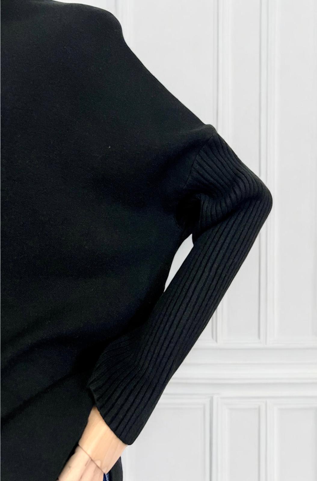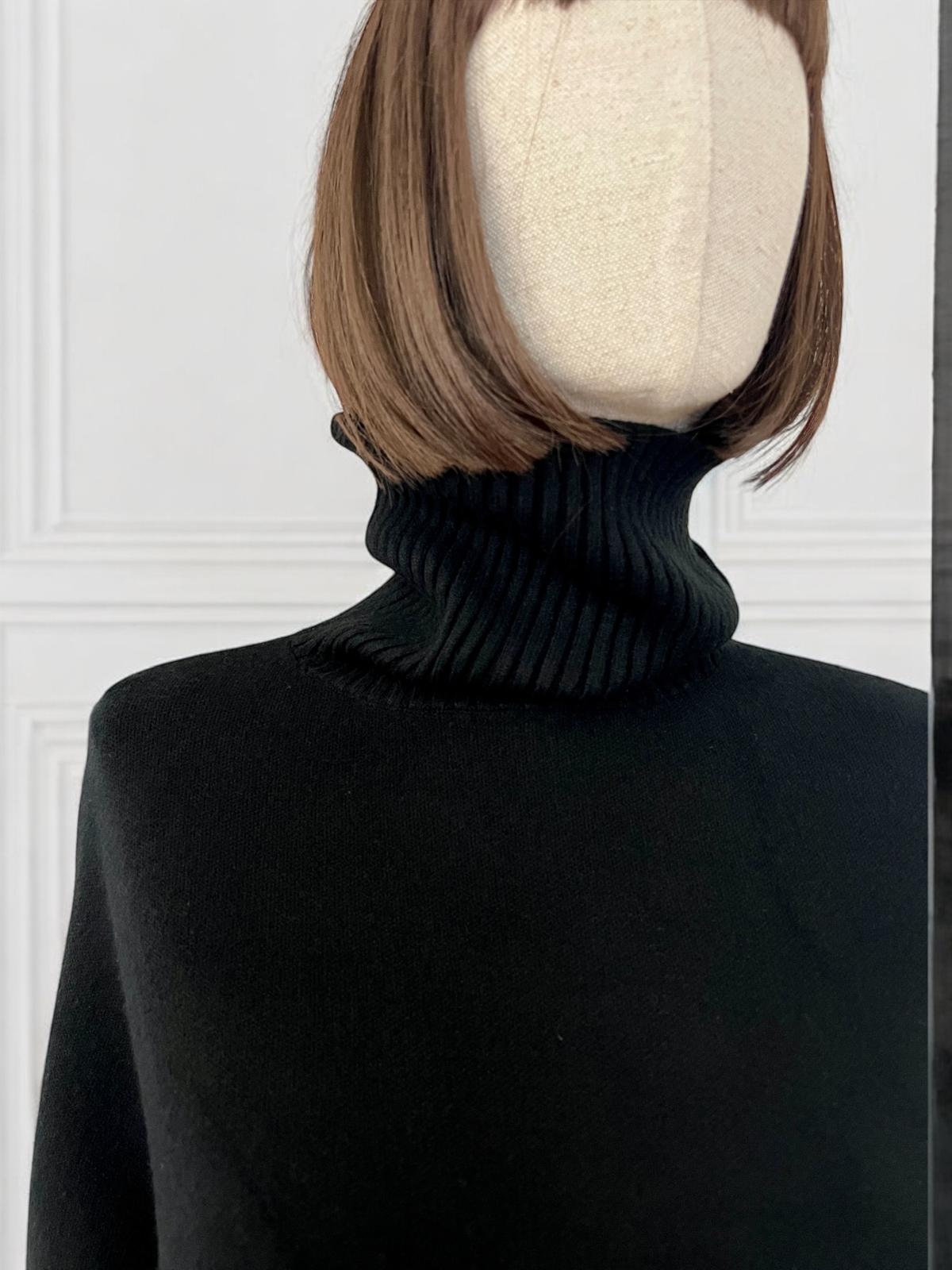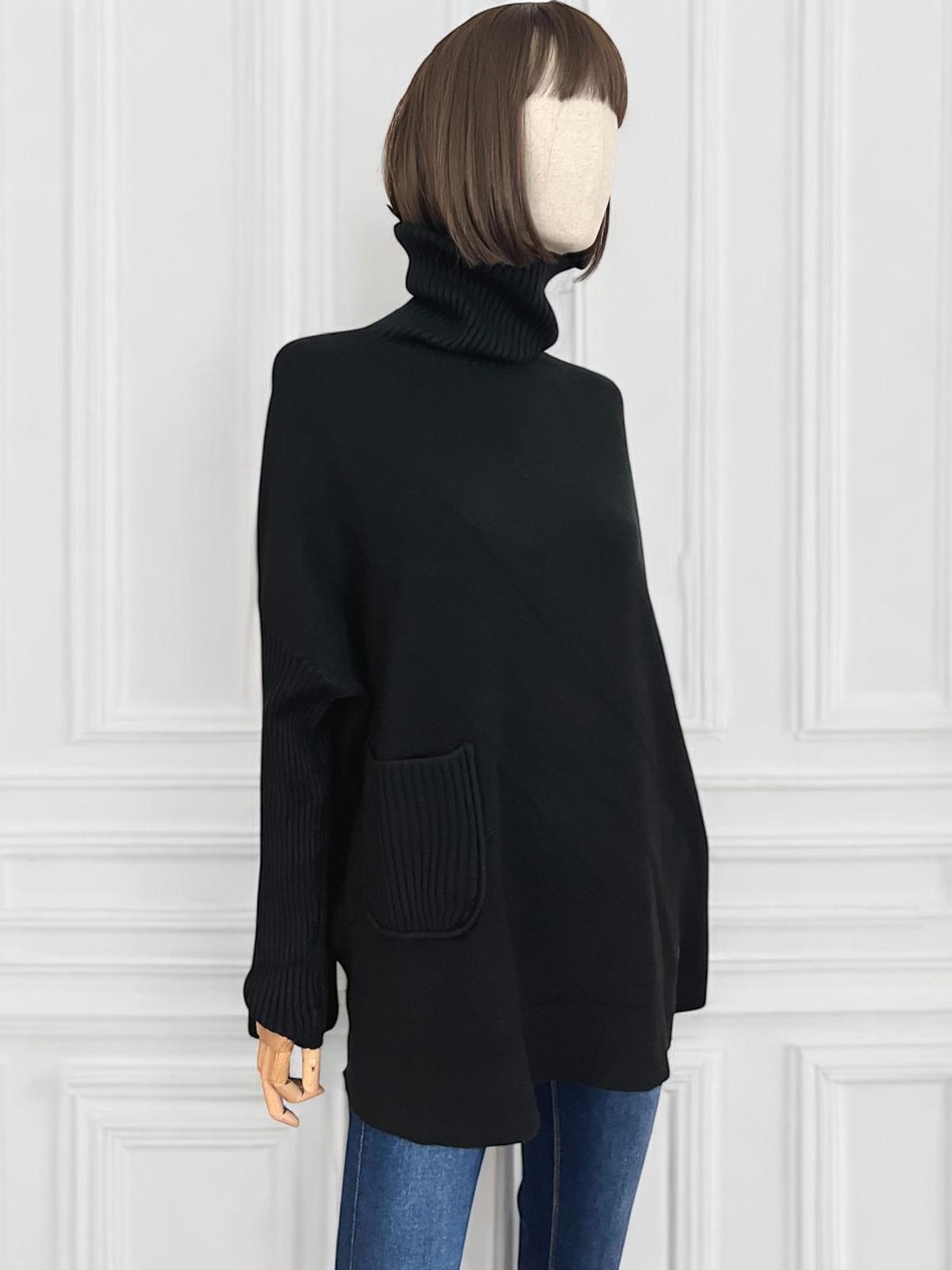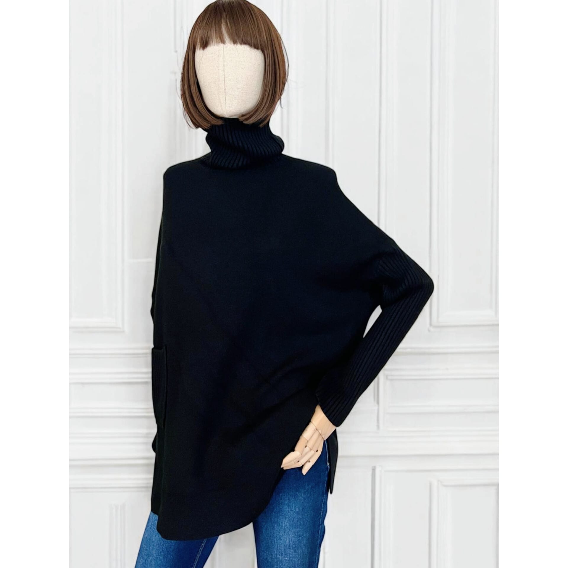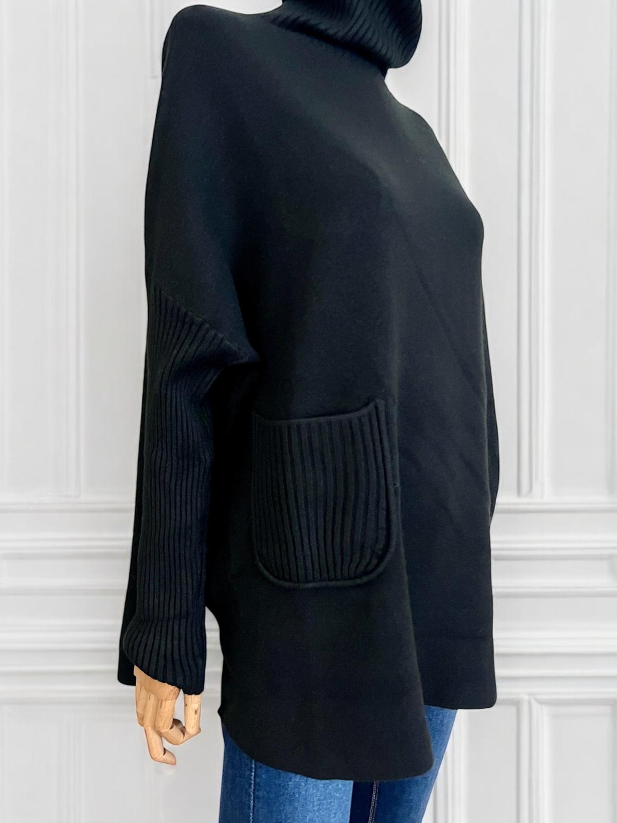 Maglia lunga in tessuto morbido e caldo. Collo alto a coste e maxi tasca sulla parte frontale. Linea diritta e morbida. Manica aderente a micro coste. Tessuto elasticizzato e confortevole. Il manichino è alto 176 cm