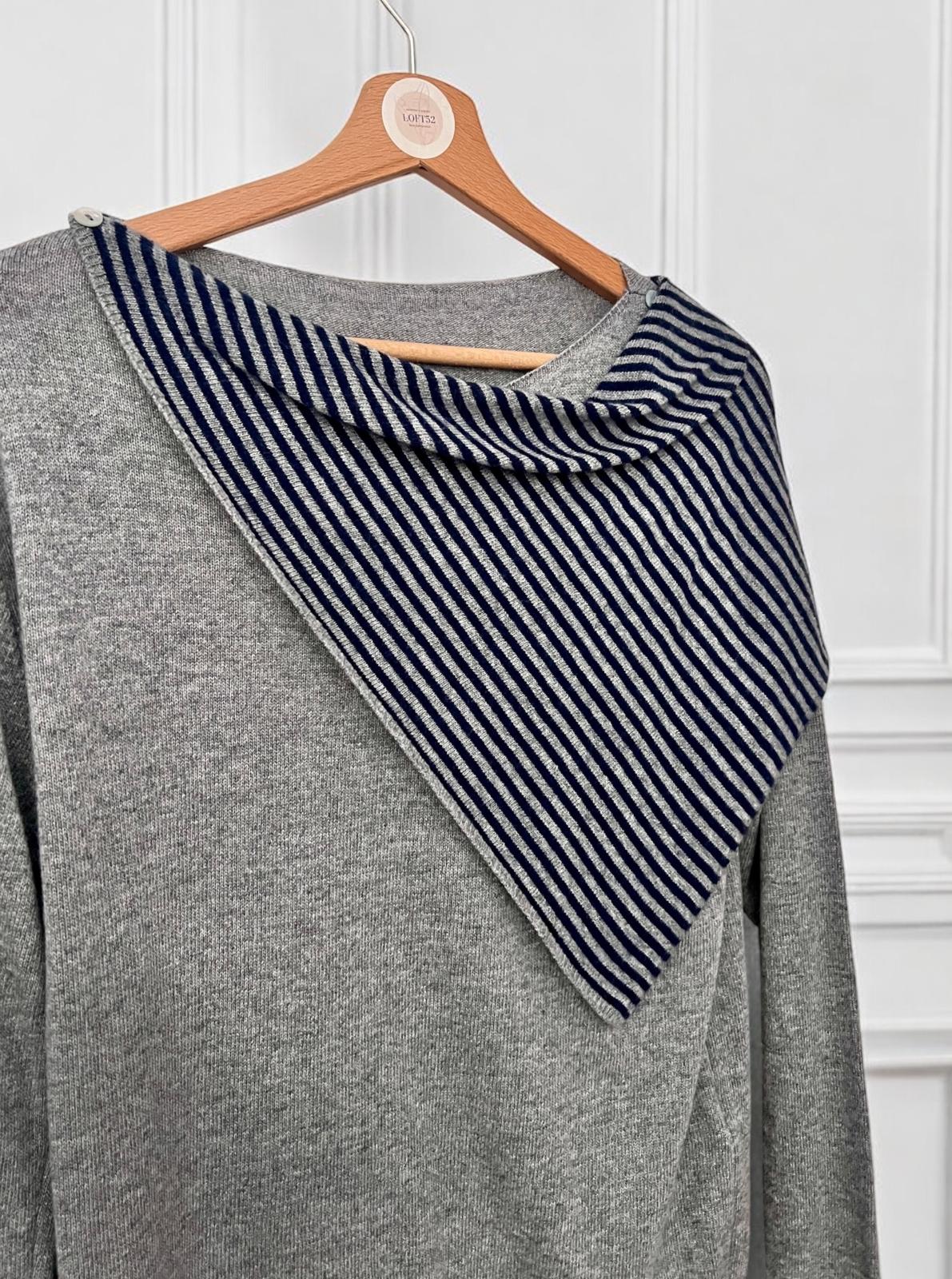 Maglia in misto lana rasata dalla linea diritta e scollo a barchetta con sciarpa removibile. Tessuto morbido e confortevole sulla pelle così come la sciarpa rigata applicata.