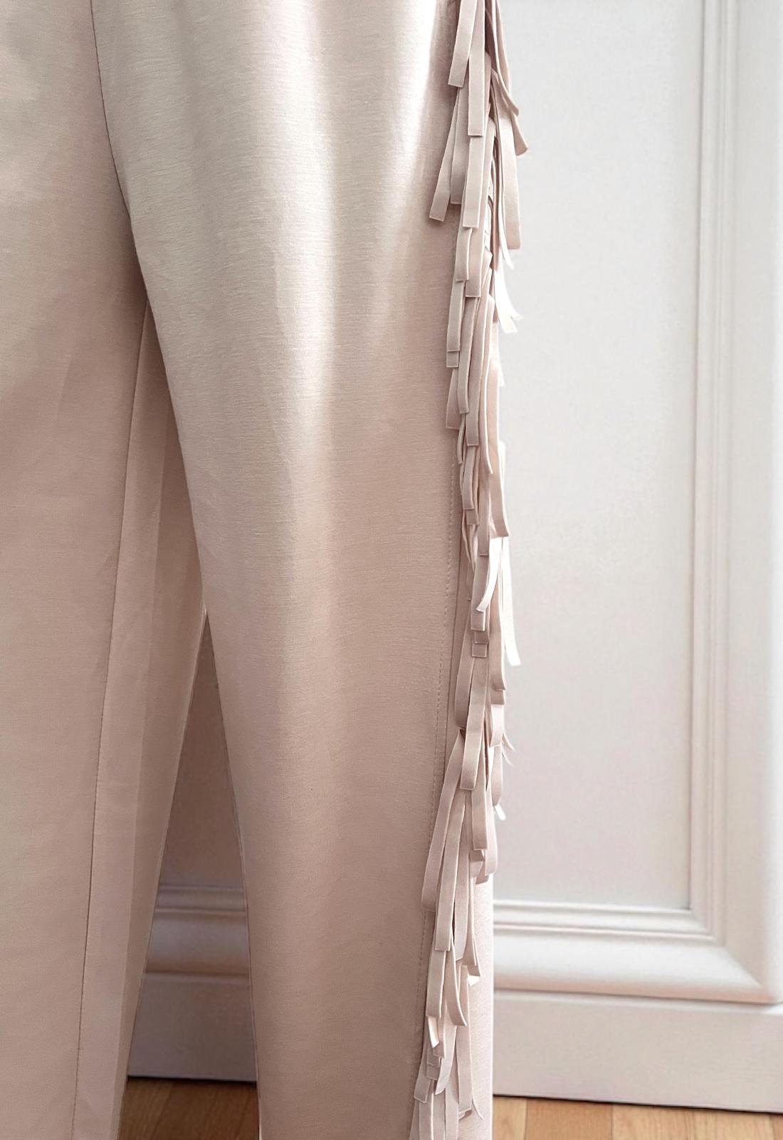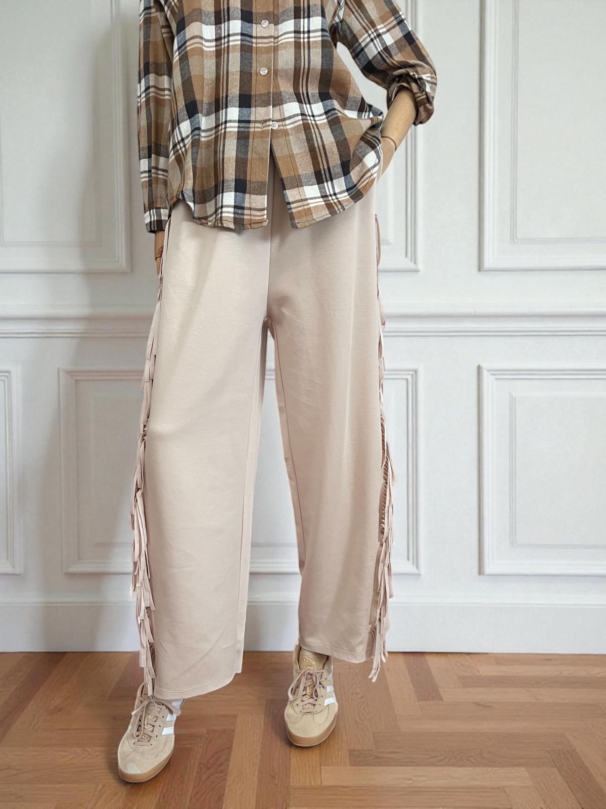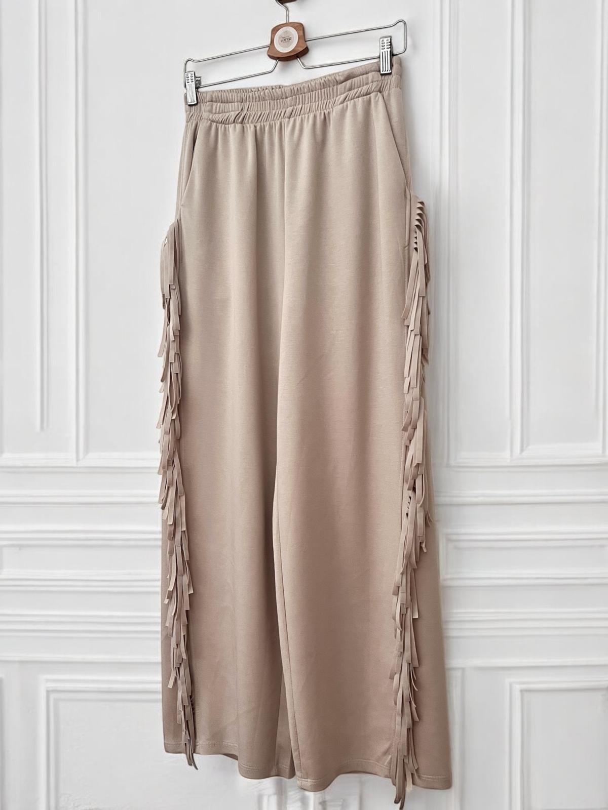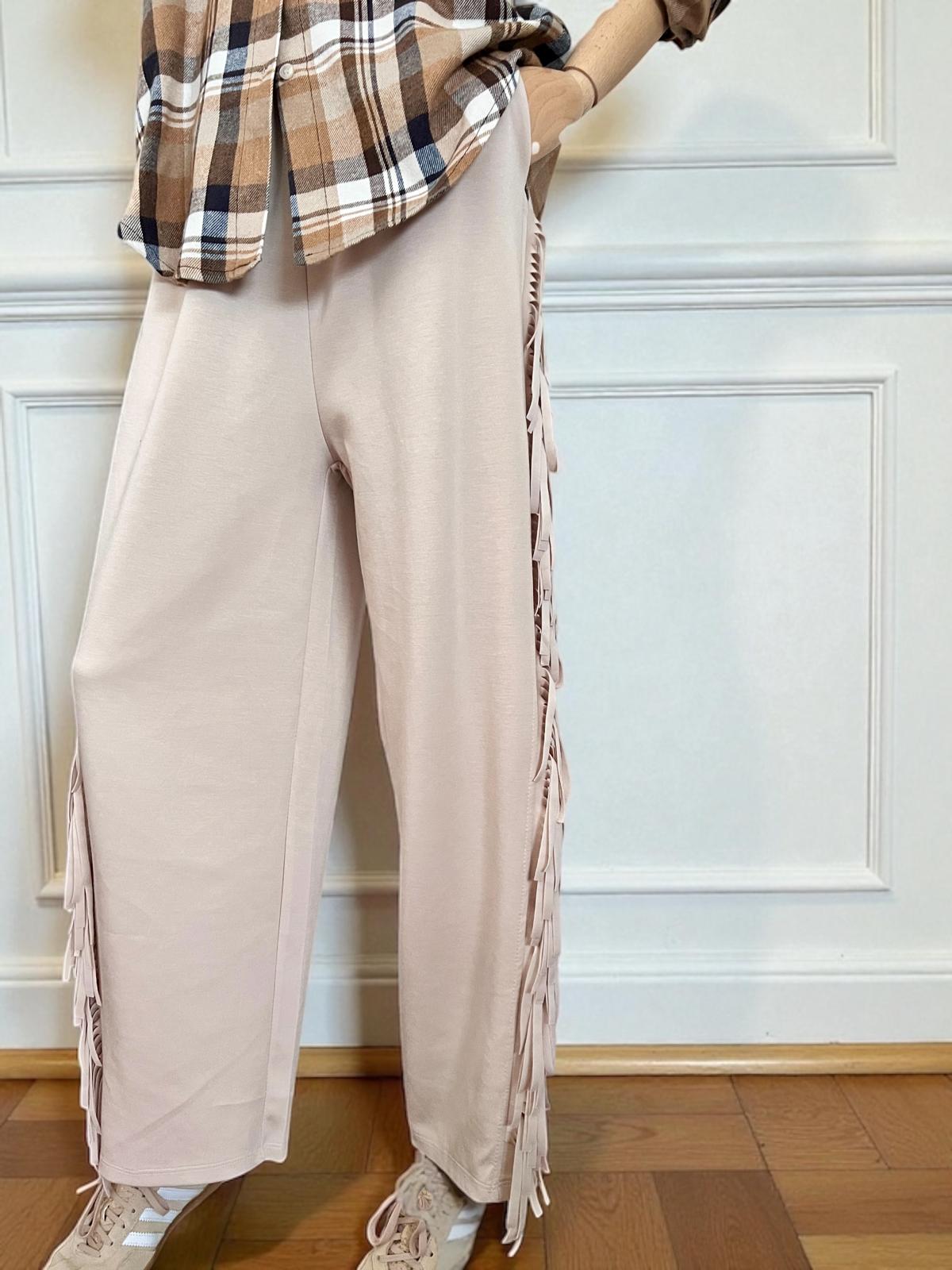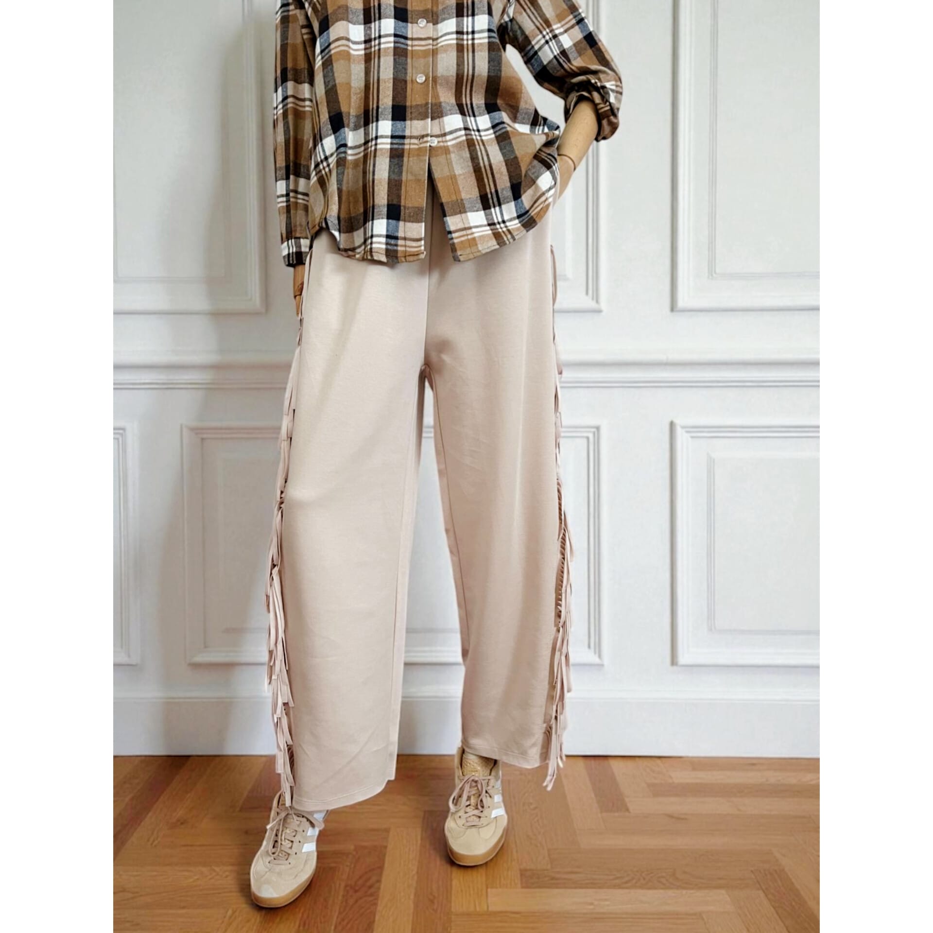 Pantalone a palazzo in tessuto scuba. Vita alta con elastico cucito e frange ai lati per tutta la lunghezza. Vestibilità comoda e rilassata. Possibilità di abbinarlo col giubbotto Mckanzy. Il manichino è alto 176 cm Misure: lunghezza totale 105 cm Vita a riposo 33 cm