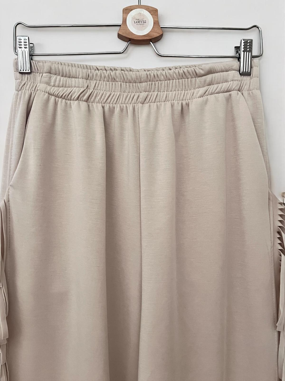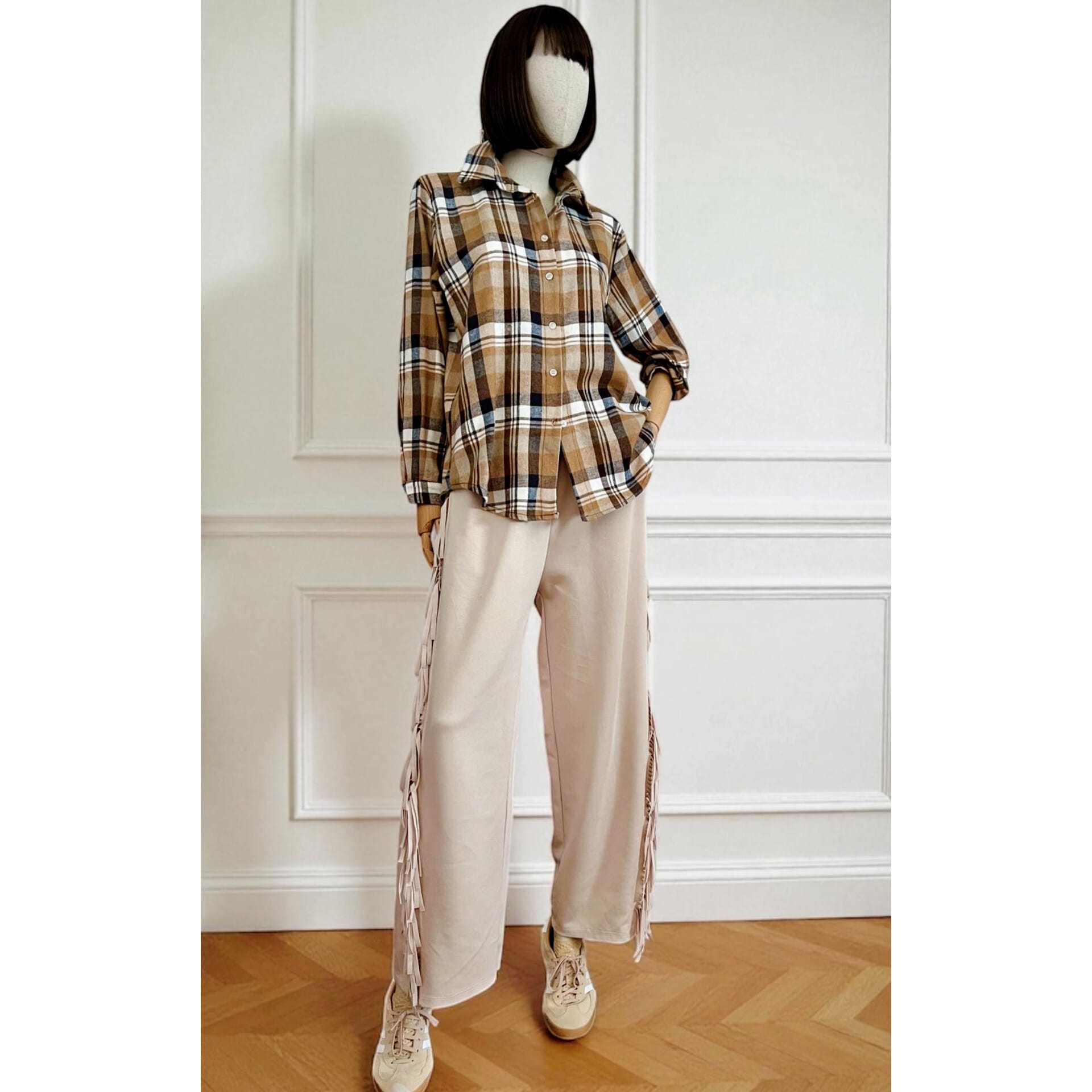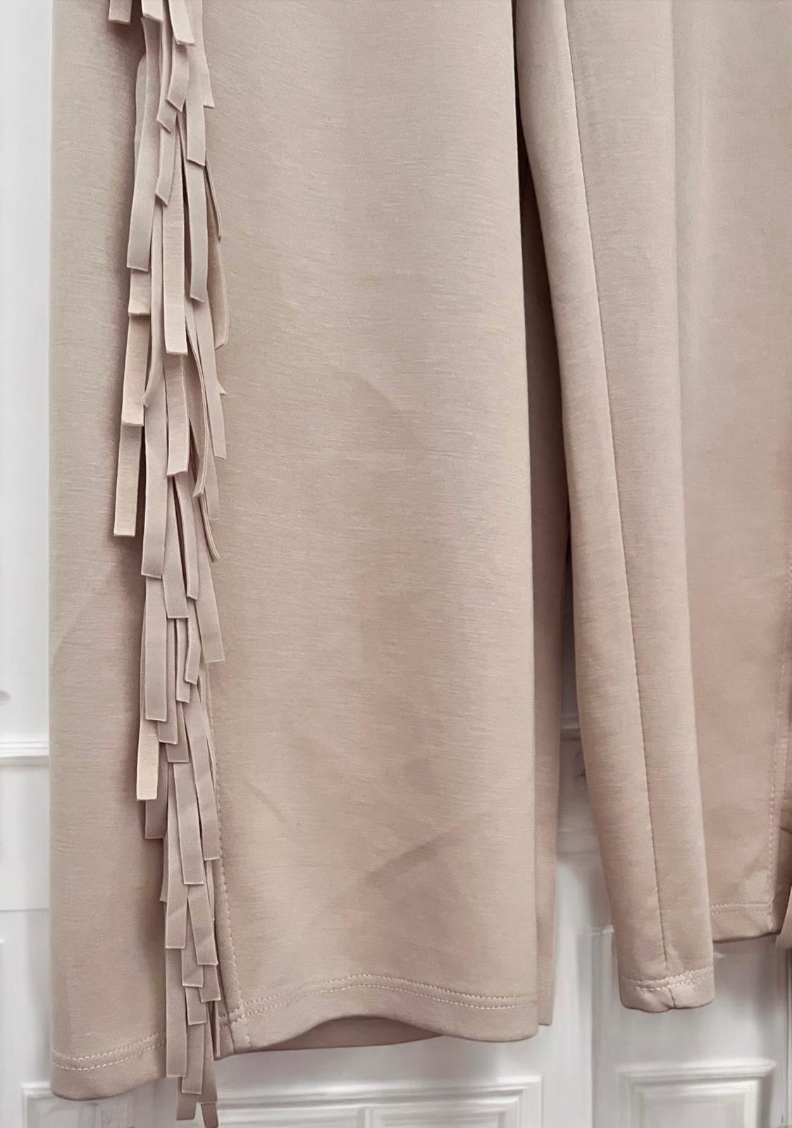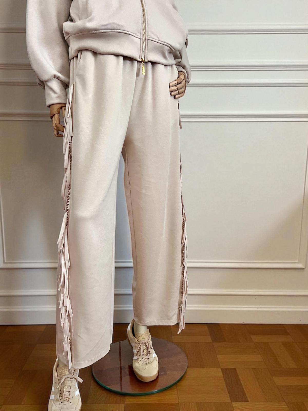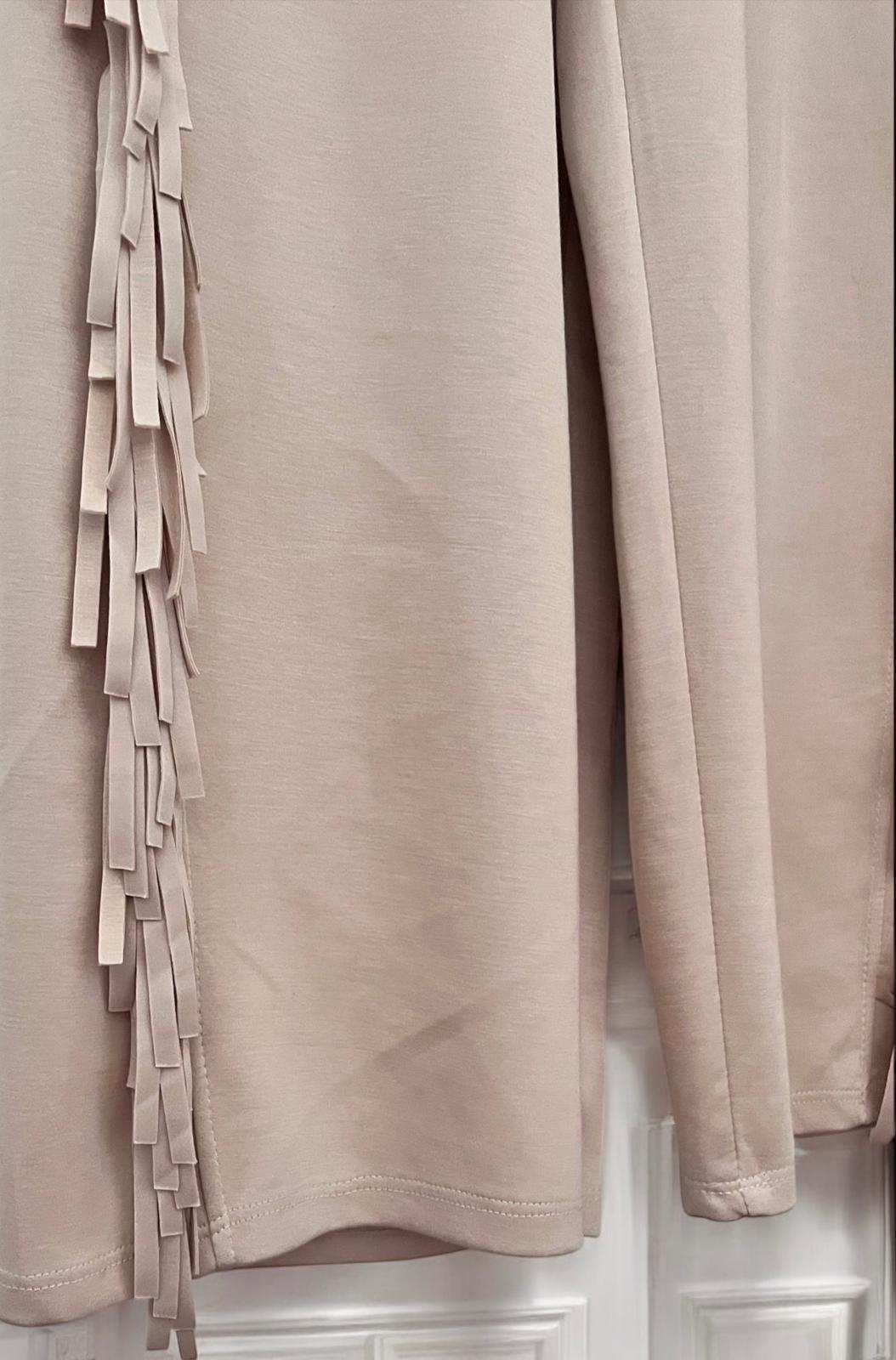 Pantalone a palazzo in tessuto scuba. Vita alta con elastico cucito e frange ai lati per tutta la lunghezza. Vestibilità comoda e rilassata. Possibilità di abbinarlo col giubbotto Mckanzy. Il manichino è alto 176 cm Misure: lunghezza totale 105 cm Vita a riposo 33 cm
