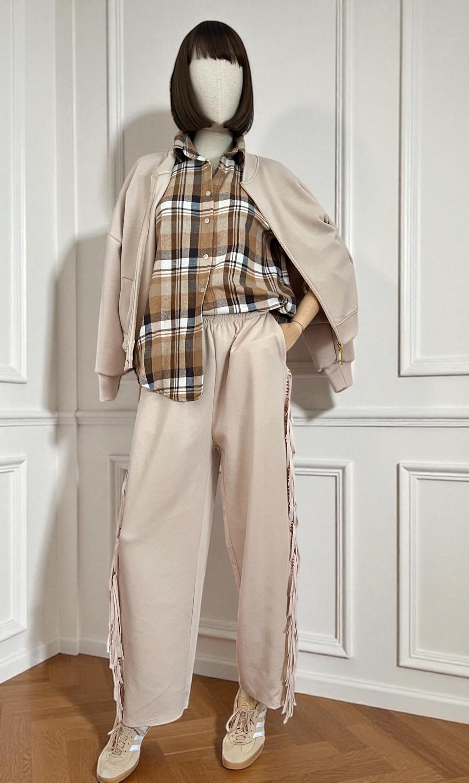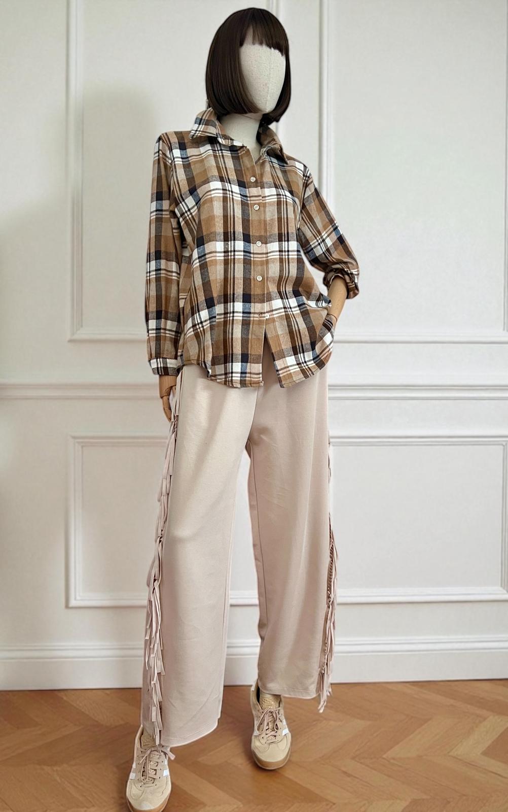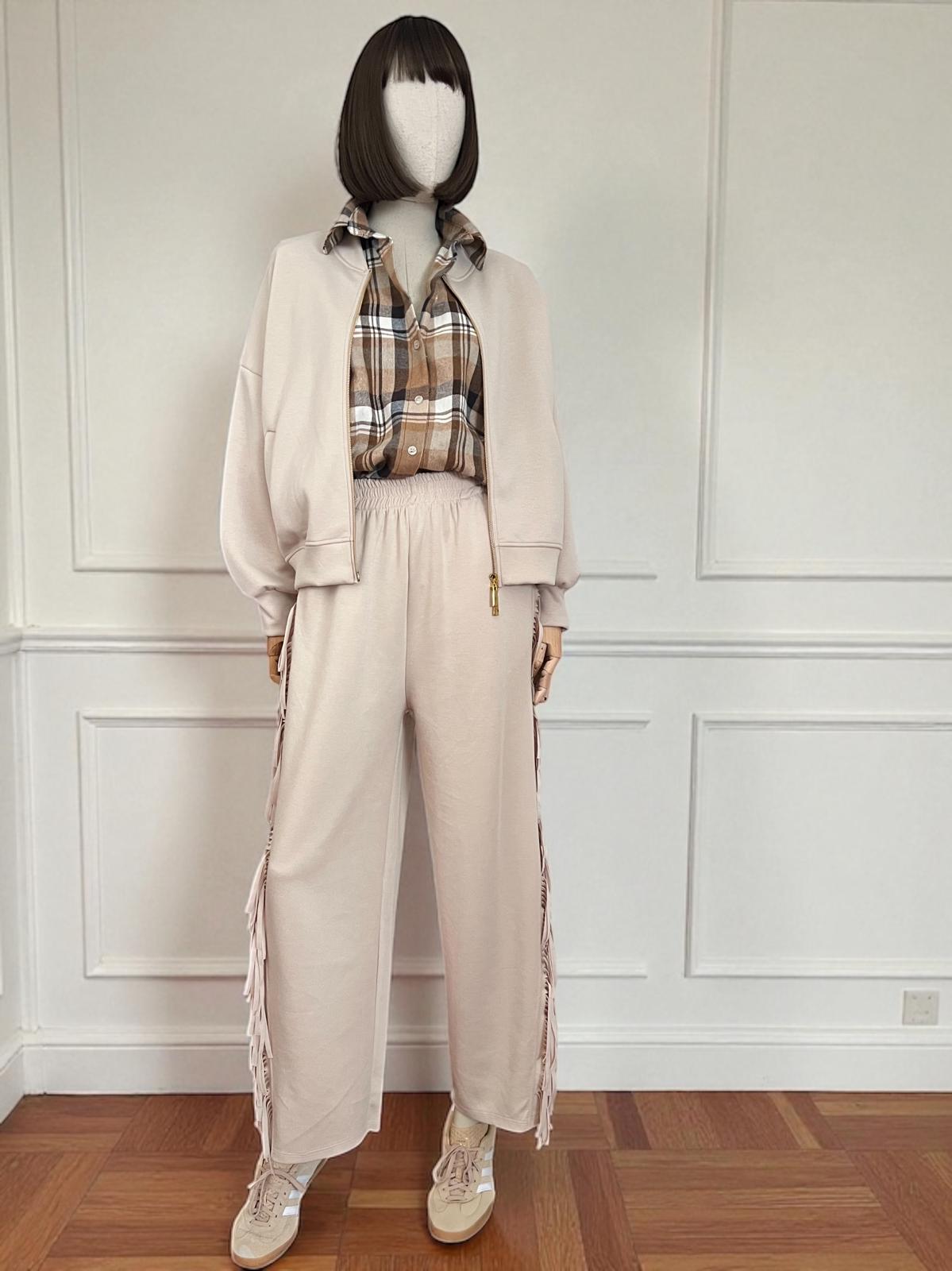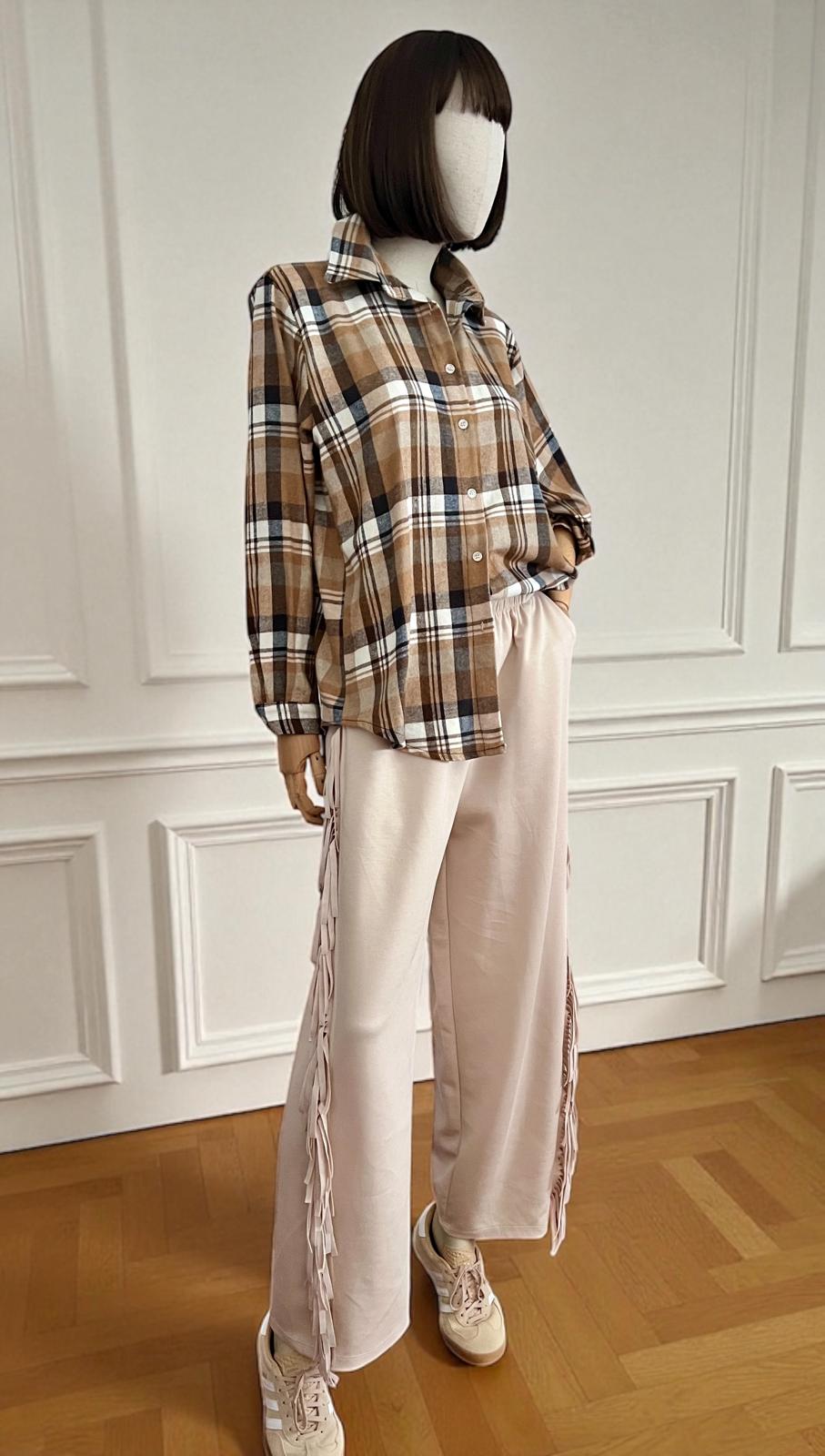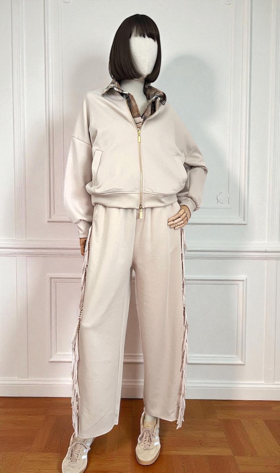 Pantalone a palazzo in tessuto scuba. Vita alta con elastico cucito e frange ai lati per tutta la lunghezza. Vestibilità comoda e rilassata. Possibilità di abbinarlo col giubbotto Mckanzy. Il manichino è alto 176 cm Misure: lunghezza totale 105 cm Vita a riposo 33 cm